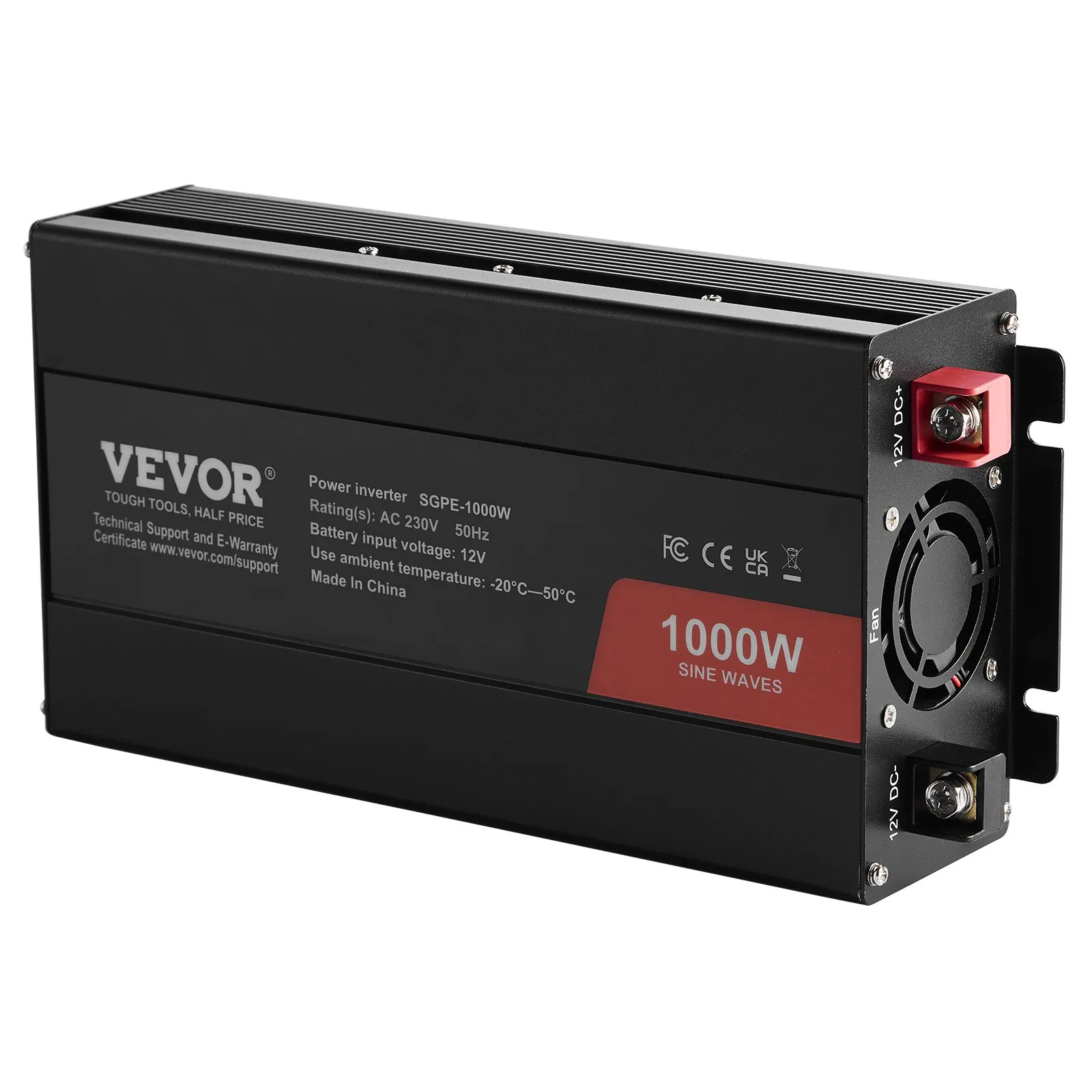 1000W menič napätia s čistým sínusovým signálom DC 12V na AC 230V s 1 AC zásuvkou, 1 USB portom, 1 portom typu C a diaľkovým ovládaním pre malé domáce spotrebiče, ako sú smartfóny a notebooky.