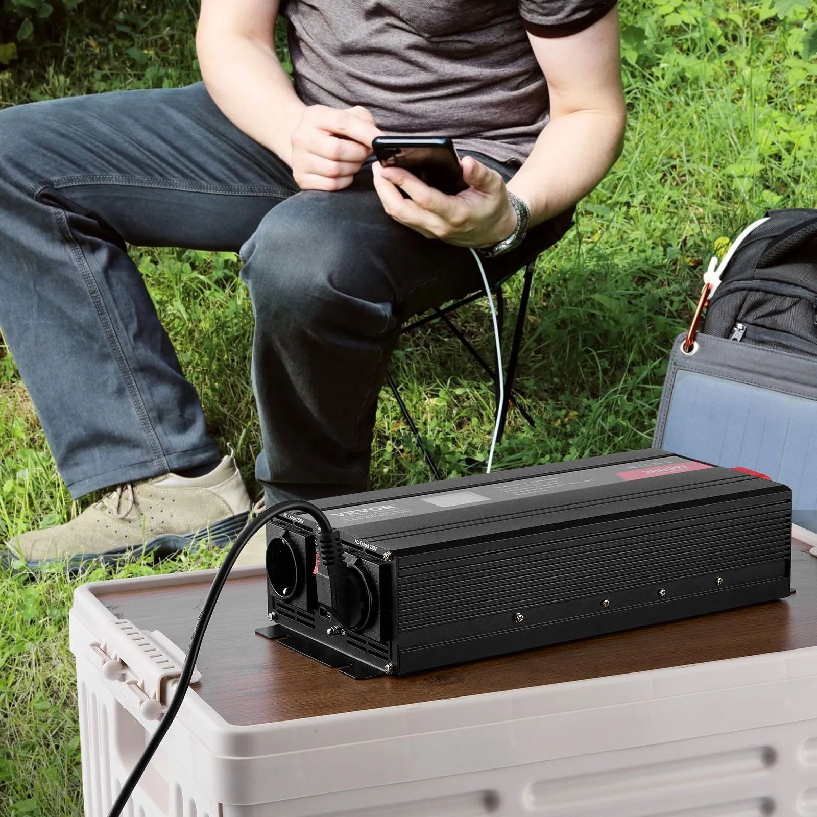 2000W menič sínusového napätia DC 12V na AC 230V s 2 AC zásuvkami, 2 USB portami, 1 portom typu C, LCD displejom a diaľkovým ovládaním pre stredne veľké domáce spotrebiče