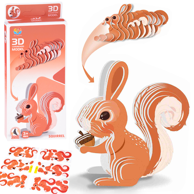 Tento 3D model z kartónu je kreatívne puzzle, ktoré deťom umožňuje samostatne zostaviť trojrozmernú figúrku veveričky. Diely sú vyrobené z farebného, odolného kartónu, ktorý sa ľahko zacvaká – stačí ich odtrhnúť a postupovať podľa pokynov na krabici.