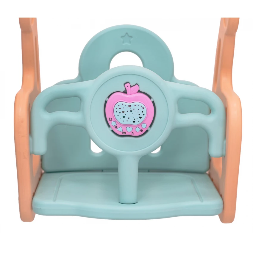 Vlastnosti: – pre deti od 1 roka, – široká, stabilná hojdačka, – sedadlo s odnímateľnou ochranou, – pevné hojdacie oblúky, ktoré zlepšujú stabilitu počas hry, – široká plošina spevňujúca konštrukciu, – vysoké hojdacie operadlo, – dlhý záver vyrobený z dvojitého plastu, – široké, bezpečné posuvné schodíky, – basketbalový kôš, – gumená loptička je súčasťou sady, – konštrukcia hojdačky, ktorá umožňuje zmenu rozloženia konštrukcie, – odnímateľné jablko so zvukovými prvkami: zvuky zvierat a ich mená, melódie, pesničky, hlasové povely v angličtine a možnosť meniť podsvietenie jablka: modré, červené, zelené, blikajúce svetlá, – maximálne zaťaženie súpravy 100 kg. |