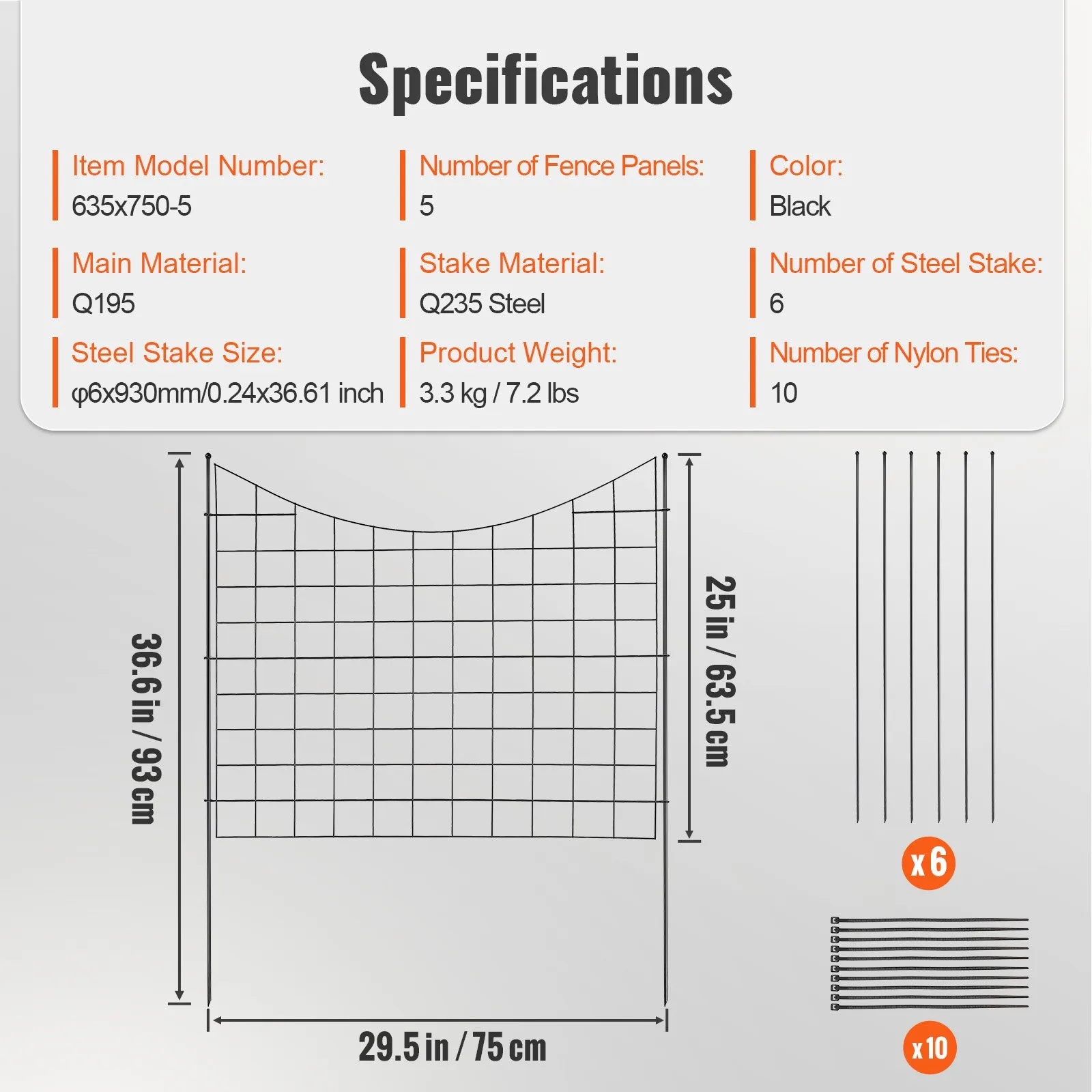 5-dielna sada dekoratívneho záhradného plotu 75x93cm, kovový plot z uhlíkovej ocele, zásuvný plot, rozostup hrotov 6,38 cm, plot pre psov, drôtený plot, plot na kvetinové záhony, kovové plotové prvky vrátane montážneho kovania