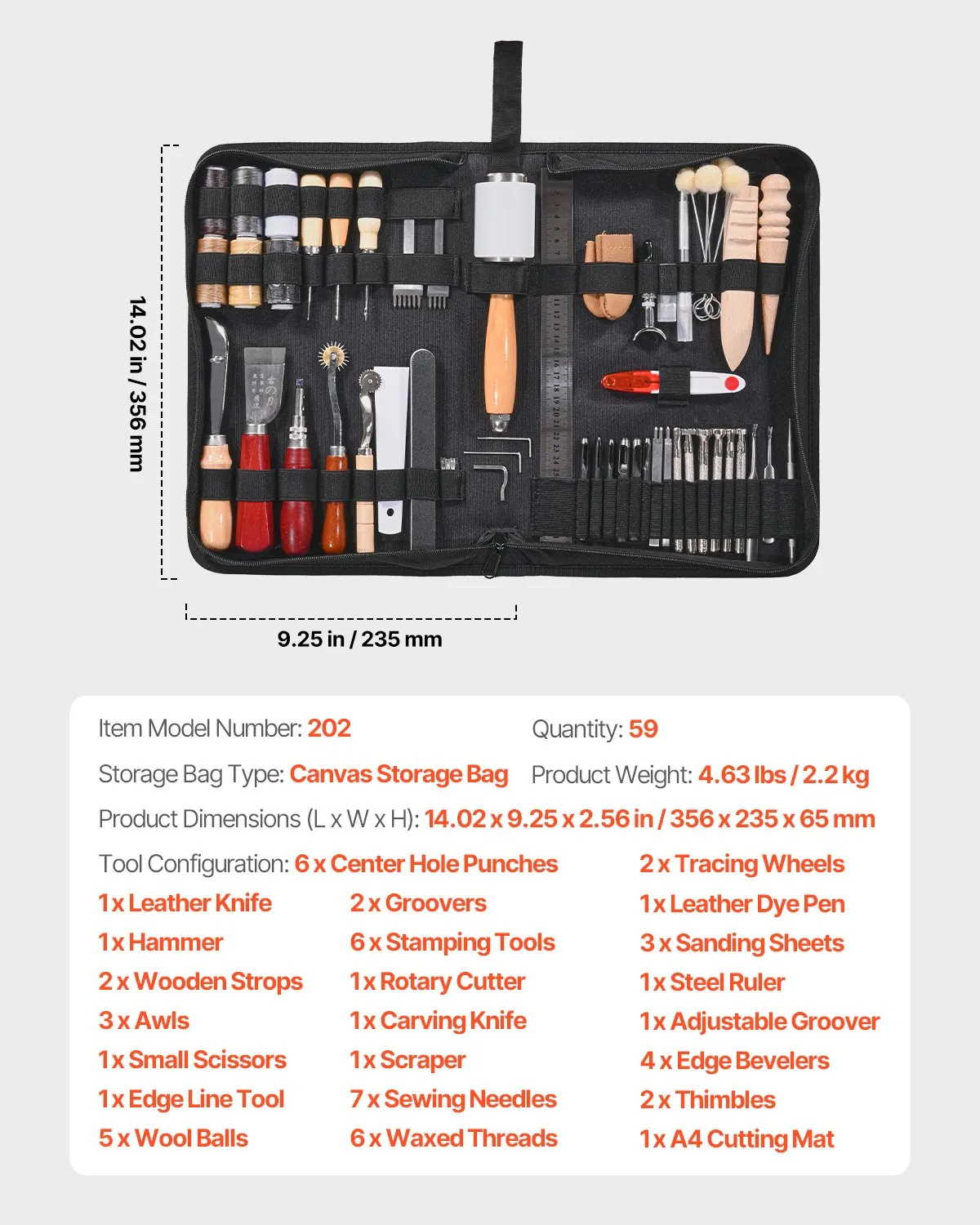 59-dielna sada nástrojov typu „všetko v jednom“: Táto sada na remeslá z kože obsahuje všetky potrebné nástroje na prácu s kožou, ktoré vám umožnia strihať, tvarovať, raziť, šiť a vychutnať si plný zážitok z práce s kožou.