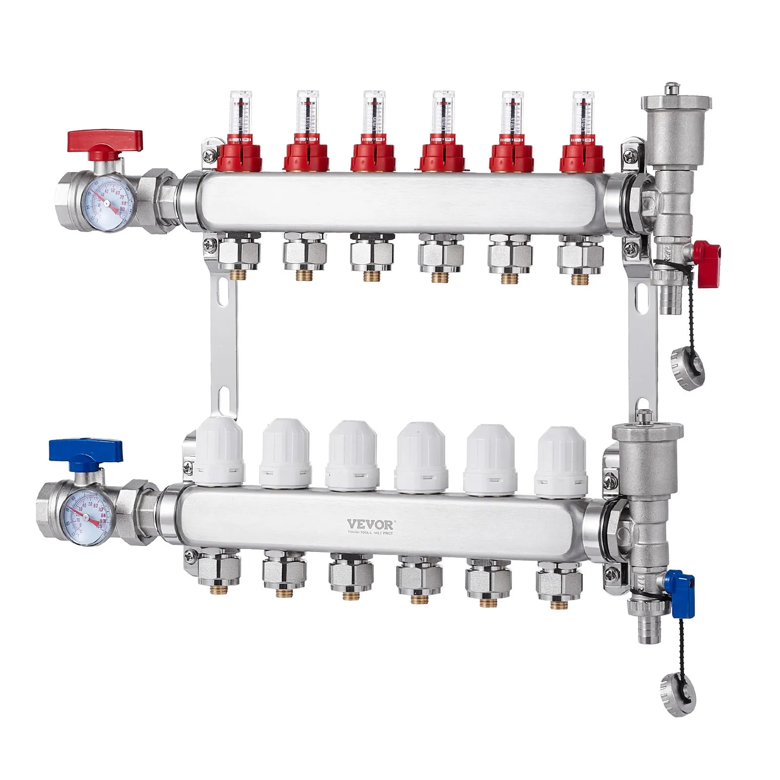 6-vetvový rozdeľovač tepla, rozdeľovač z PEX rúrok 1/2″, rozdeľovač PEX z nehrdzavejúcej ocele pre hydronické podlahové vykurovanie, sada rozdeľovačov PEX na rozvod tepla s adaptérmi 1/2″ súčasťou balenia
