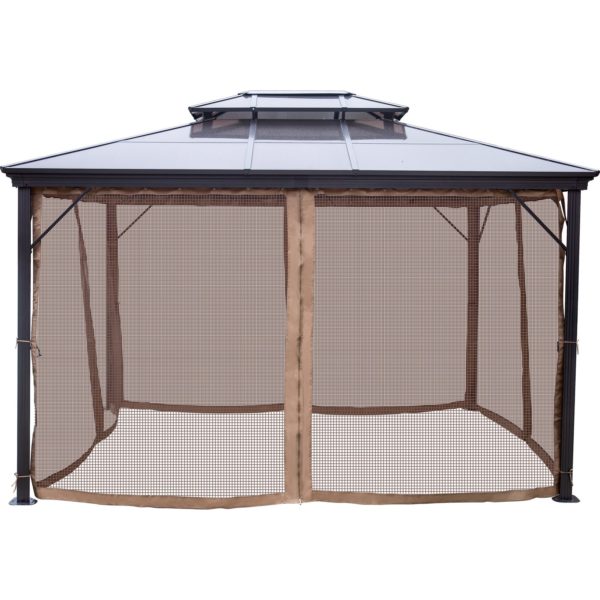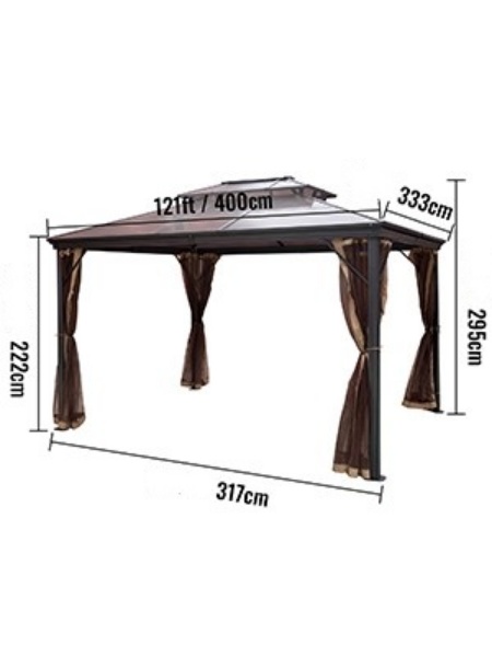 Hliníkový rám – Náš baldachýn altánku je vyrobený z hliníkového nosného rámu odolného proti korózii. Súčasťou balenia je všetok potrebný hardvér a návod na inštaláciu pre vašu jednoduchú montáž. Nohy s otvormi a kolíky do zeme na zvýšenie stability, štyri rohy zosilnené pre väčšiu odolnosť.