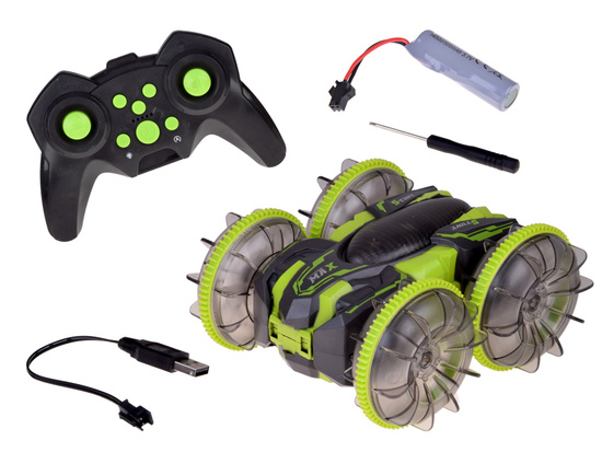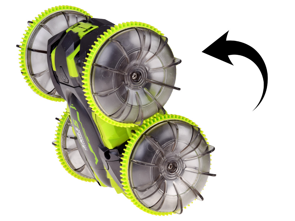 Diaľkovo ovládané obojživelné kaskadérske auto je jedinečné vozidlo pre mladých fanúšikov áut a veľkolepých kaskadérskych kúskov. Vďaka inovatívnemu dizajnu a 360° otáčaniu môže auto pokračovať v jazde aj po prevrátení!