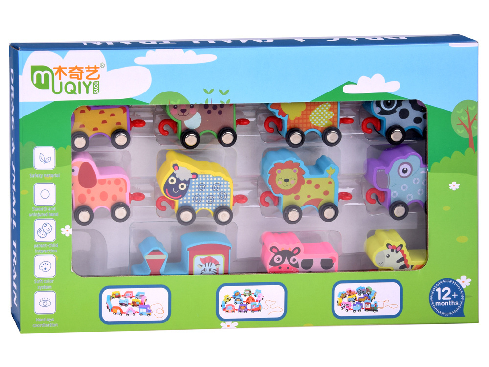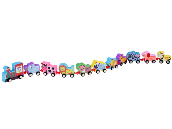 . Hračka je vyrobená z dreva, s plastovými kolesami a hákmi. Farby a grafika vláčikodráhy sú veľmi atraktívne a povzbudia každé dieťa k hre.
