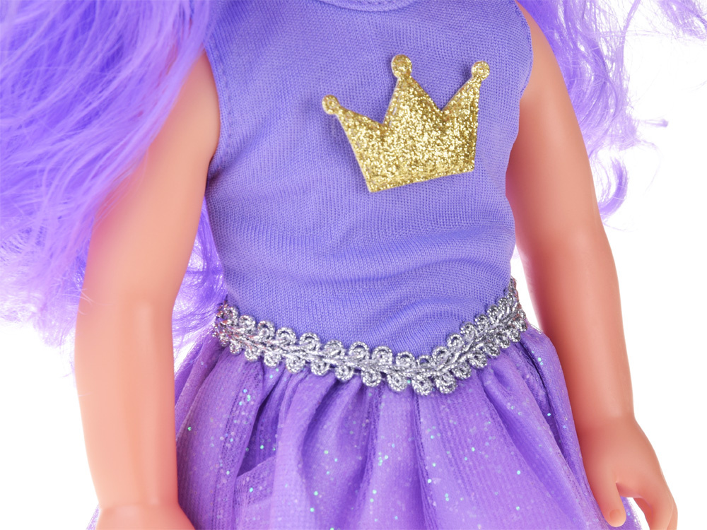 Táto pôvabná bábika s dlhými fialovými vlasmi je skutočnou kráľovnou fialovej. Malé dievčatká milujú ružovú a fialovú a táto bábika je skutočnou kráľovnou týchto farieb.