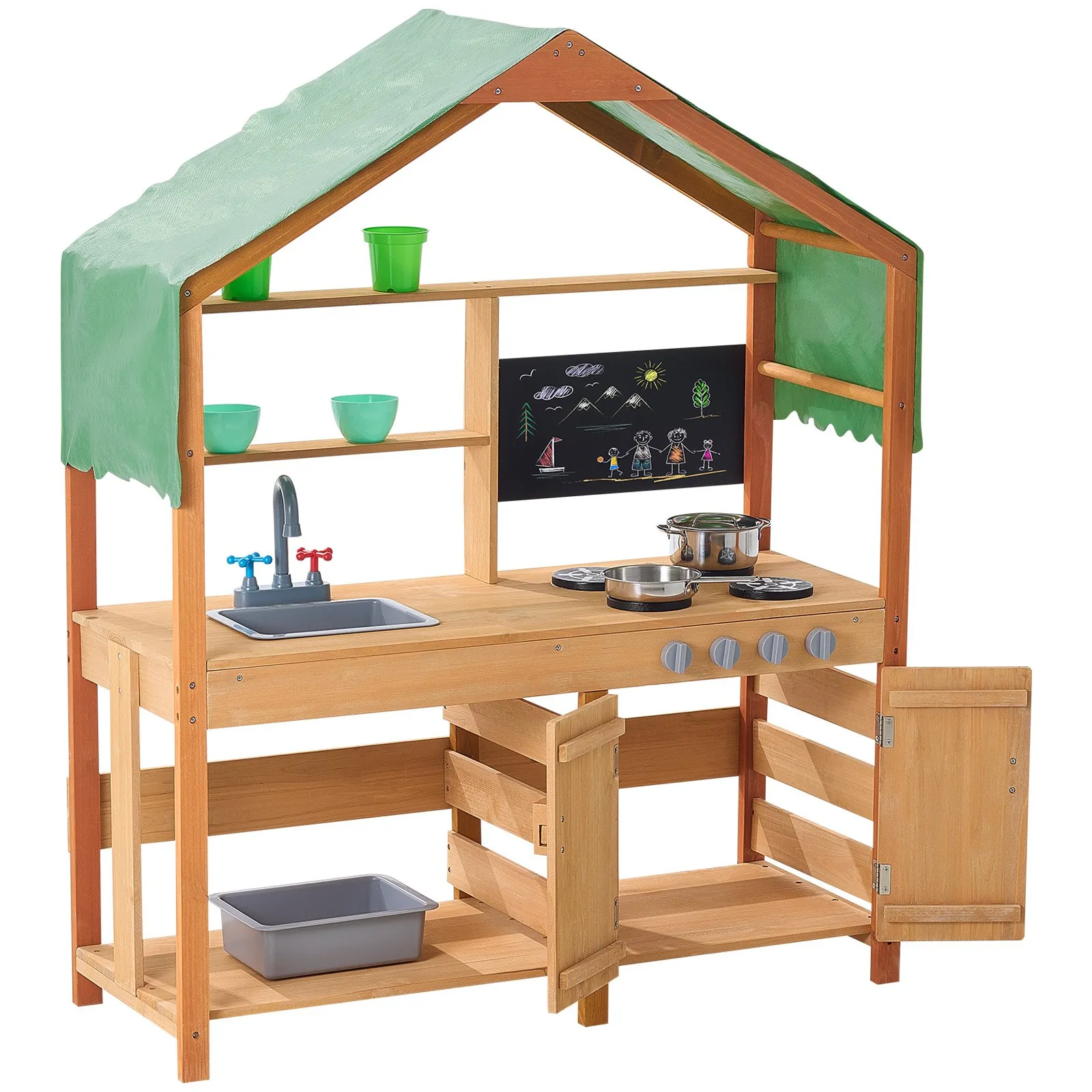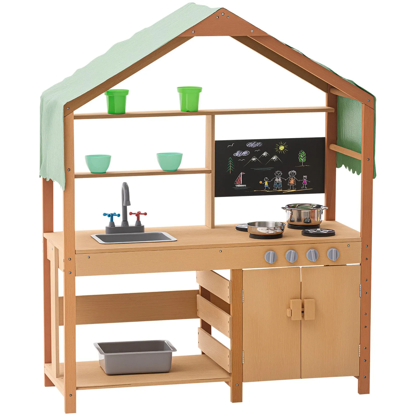 Bahenná kuchynka pre deti, drevená hračkárska kuchynská súprava s príslušenstvom, vonkajšia detská kuchynka, kuchynka na hranie rolí vrátane príslušenstva, ako sú sporák, kvetináče, drez, batéria, tabuľa, riad