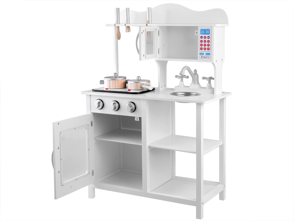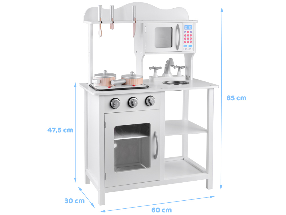 Elegantná biela kuchynka s hrncami na hranie domčeka poskytne každému malému kuchár s množstvom zábavy. Kuchynka je vybavená indukčnou varnou doskou so zvukovými a svetelnými efektmi, štýlovou kovovou misou slúžiacou ako drez, vodovodnou batériou s otočnými kohútikmi. Dvere skriniek sa zatvárajú na magnet. Štýlová kuchynka s drevenými hrncami a príbormi poskytne skvelú zábavu každému malému dieťatku. Na indukčnej varnej doske je počuť efekt bublania vody a varenia.Drevená kuchynka v bielej farbe má: – pracovnú dosku s indukčnou varnou doskou – drez – kovová odnímateľná misa- plastový kohútik- polička na drevené príbory- mikrovlnná rúra s otváracími dvierkami- tri strieborné kohútiky, ktoré pri otáčaní vydávajú charakteristický zvuk – otváracia skrinka s policou- otvorená polica na príslušenstvo- drevená panvica s pokrievkou- drevený hrniec s pokrievkou- drevený nôž, lyžica, vidličkaRozmery: – výška 85 cm- výška k doske 47,5 cm- dĺžka dosky 60 cm- hĺbka 30 cm