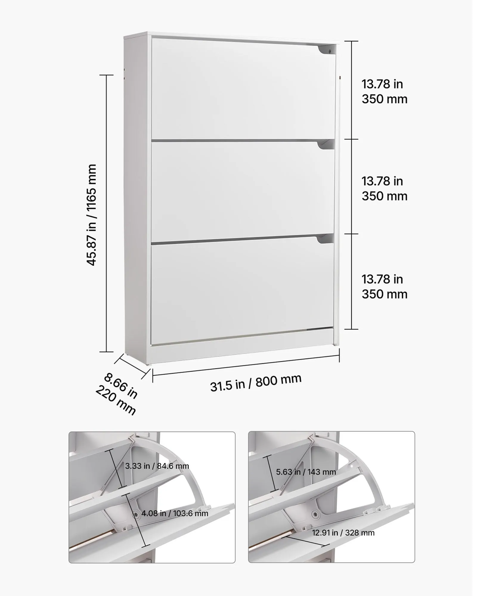 Priestorovo úsporný dizajn: S rozmermi 800 x 220 x 1165 mm (31,5 x 8,66 x 45,87 palca) sa tento úzky stojan na topánky zmestí aj do úzkych priestorov, ako sú chodby alebo schodiská, a pomôže vám tak čo najlepšie využiť obmedzený priestor.