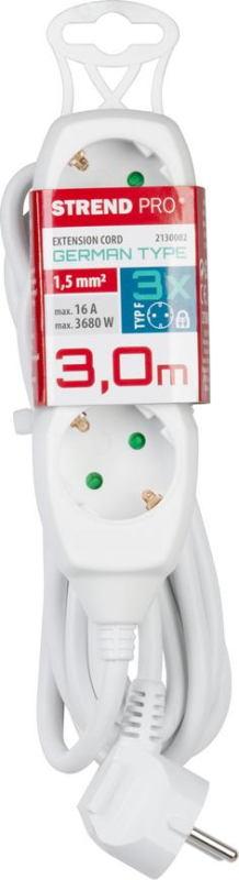 Predlžovací kábel Strend Pro DG-803B v klasickom bielom prevedení má dĺžku 3 metre. Kábel je učený pre krajiny s nemeckými zásuvkami typu F. Kábel má detskú poistku, takže sa nemusíte obávať pokiaľ mate malé deti. Do kábla môžete zapojiť tri ľubovoľne spotrebiče.