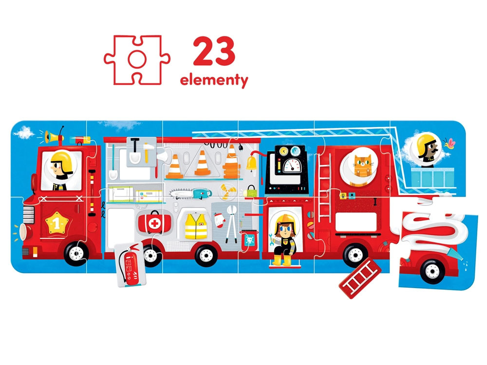 Táto farebná, veľká panoramatická skladačka zobrazuje plne vybavené hasičské auto a jeho statočnú posádku. Okrem tradičných dielikov skladačky obsahuje aj odnímateľné dieliky, ktoré je potrebné vložiť do príslušných otvorov rôznych tvarov. Je to perfektné prvé viacdielne puzzle pre batoľatá, nielen pre nadšencov hasičov. Táto vzdelávacia sada obsahuje sprievodcu plným nápadov na rôzne zábavné a vzdelávacie aktivity.