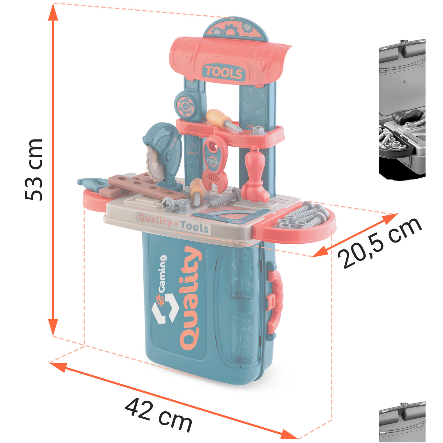 Predstavujeme pracovný stôl pre deti, vybavený policami a sadou náradia, ktoré pripomína skutočné, len z ľahko čistiteľného plastu.