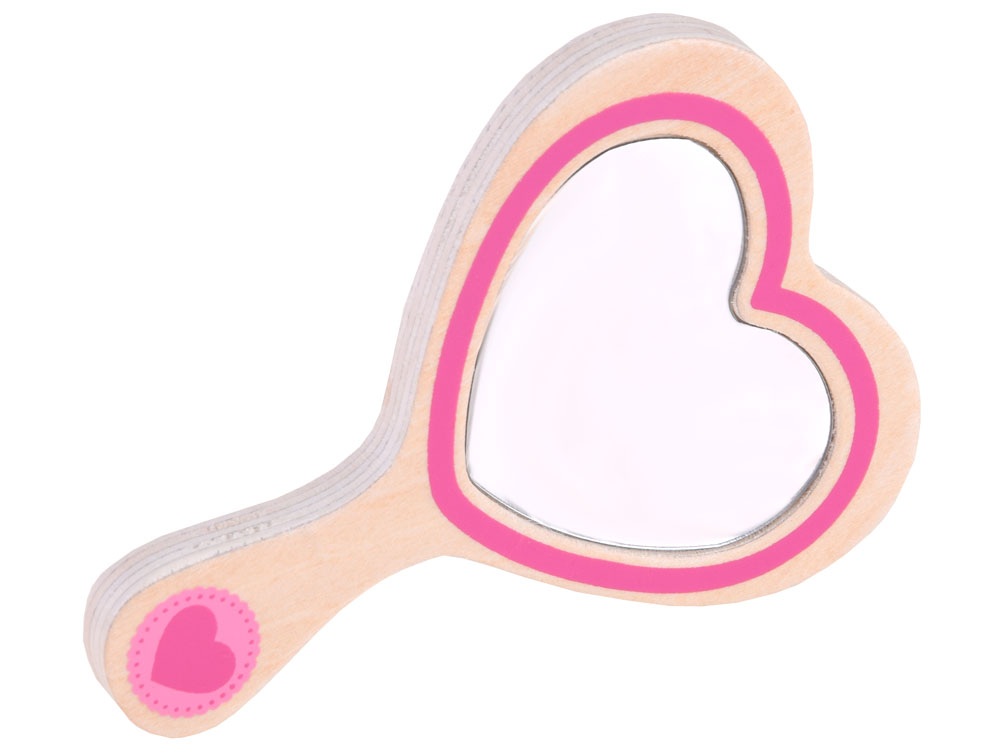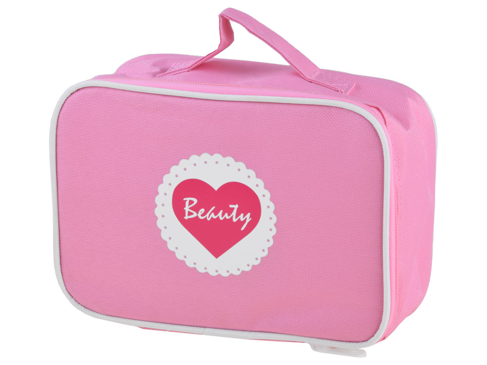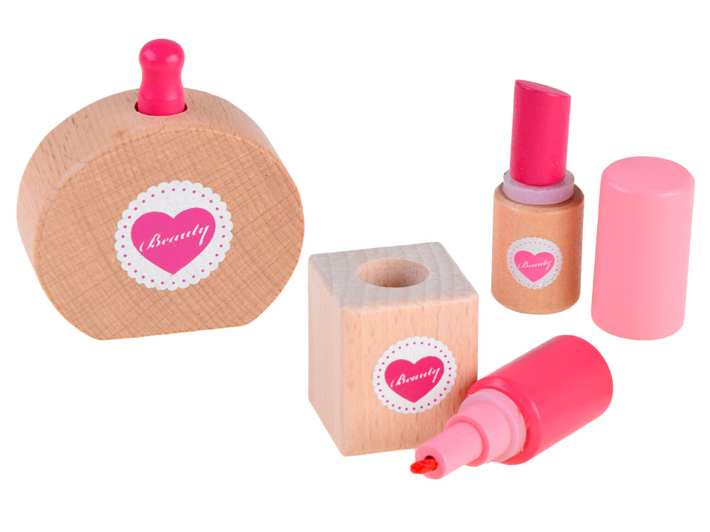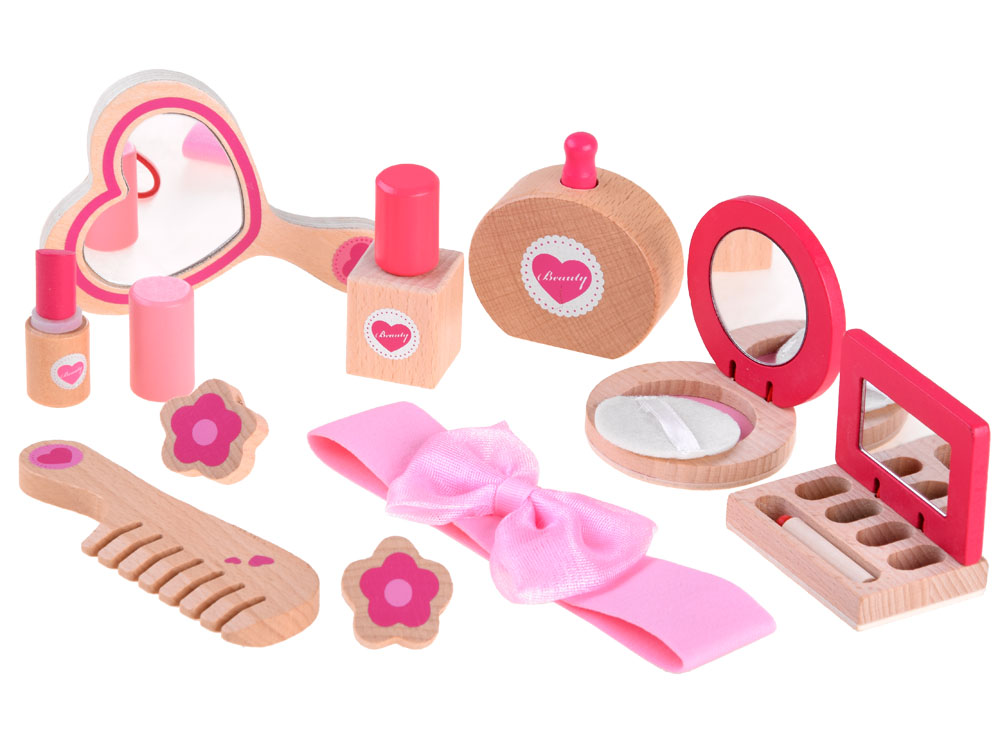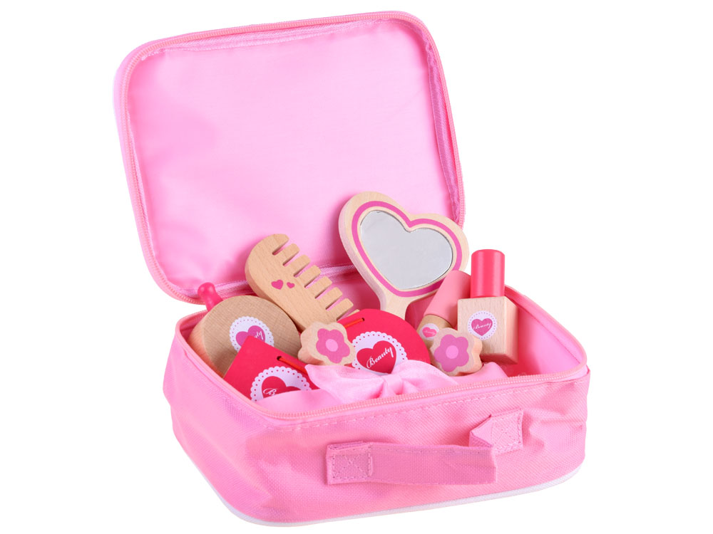 Sada obsahuje:- ružové látkové puzdro so zipsom – ružová čelenka s mašľou – drevené, bezpečné zrkadlo v tvare srdca – hrebeň – imitácia rúžu – fľaštička „lak na nechty“ – flakón „parfum“ – kompaktný púder so zrkadlom a hubkou- paleta očných tieňov- kvetinové gumičky do vlasov