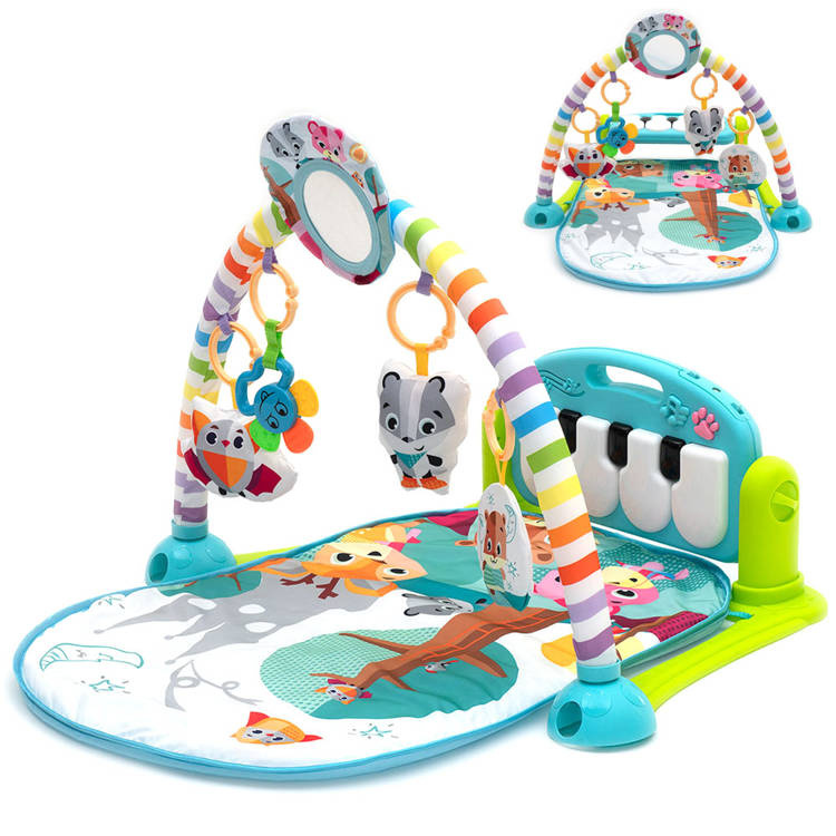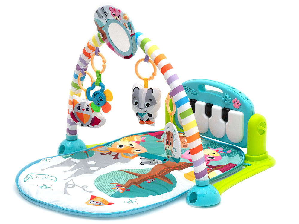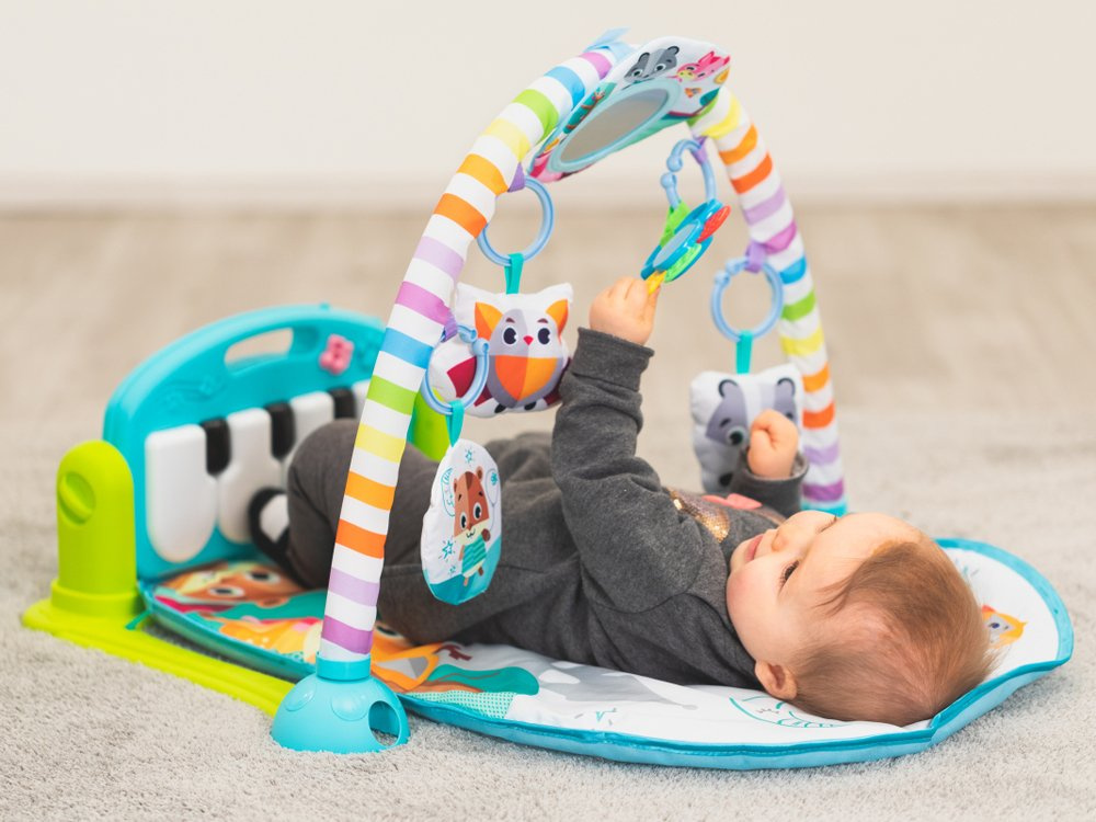 – miesto na precvičovanie – keď vaše dieťa dokáže samostatne zdvihnúť hlavu, oblúk je pripevnený k prednej časti podložky. Leží na brušku a hračky má ľahko na dosah. Pohybom nôh a udieraním do klávesov bude počuť zvuky klavíra.
