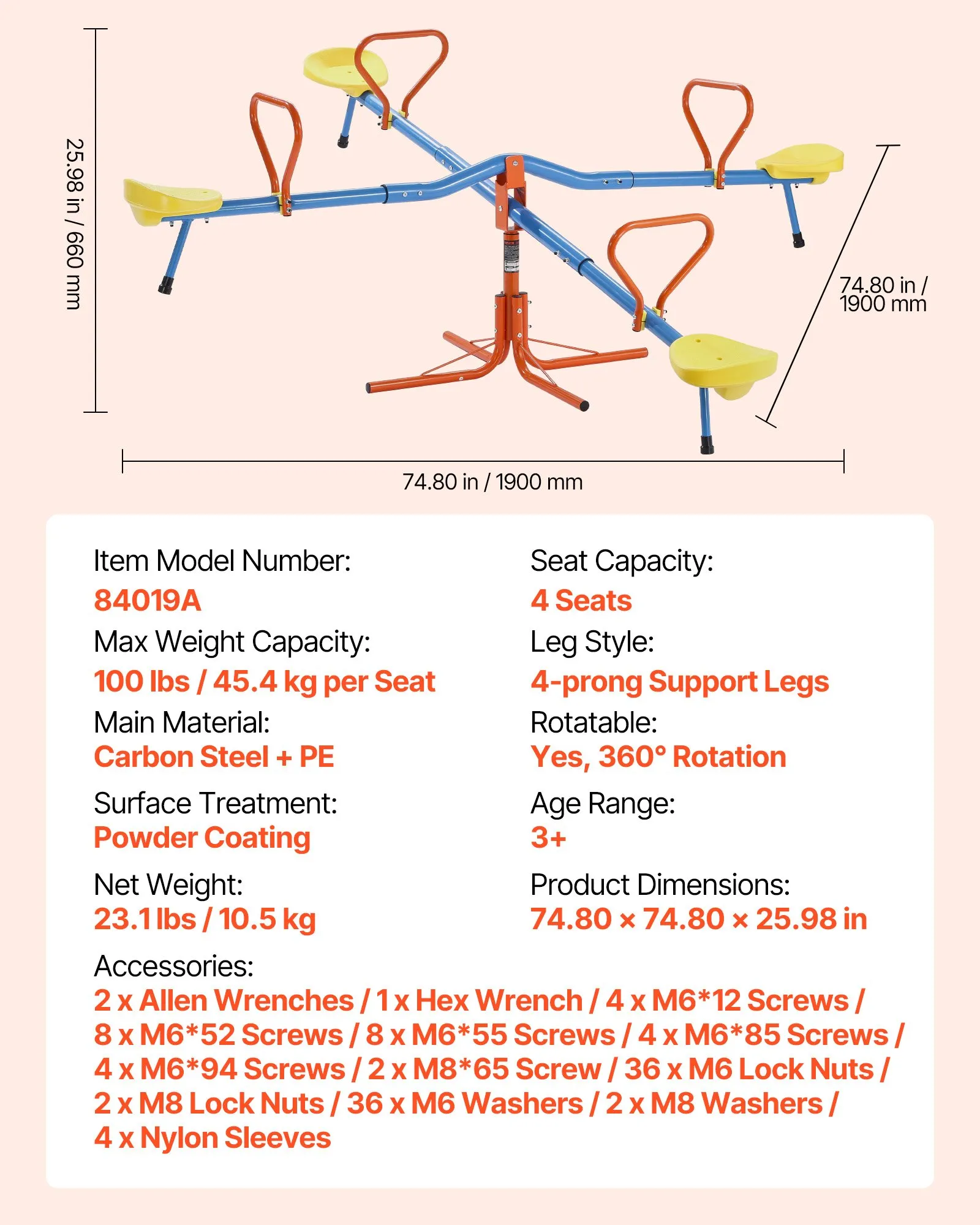 Detské hojdacie kreslo, nosnosť 45,4 kg na sedadlo, záhradné hojdacie kreslo so 4-ramennými opornými nohami, kolotočové hojdacie kreslo, 360-stupňová rotácia, pre deti od 3 rokov, 4-miestne hojdacie kreslo, 190x190x66 cm