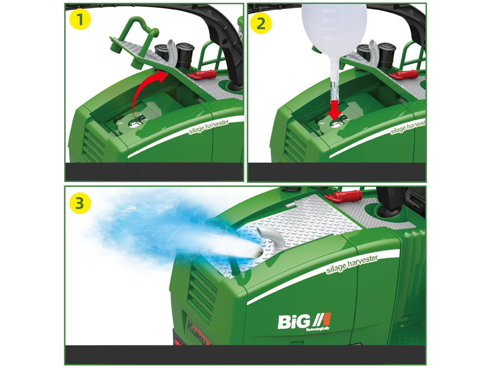 Najväčším lákadlom je nepochybne funkcia dymenia. Stačí naliať vodu do nádržky umiestnenej pod strieborným vekom pomocou dávkovacej fľaše. Po stlačení tlačidla dymenia na diaľkovom ovládači sa zo zadnej časti kombajna začnú stúpať oblaky pary, ktoré sú navyše osvetlené malou LED diódou v tele. Efekt je veľmi realistický.