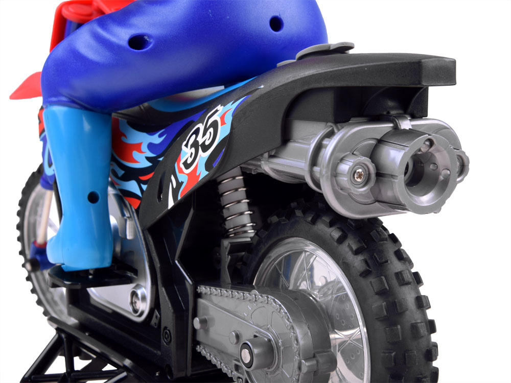 Tento motocykel Cross s diaľkovo ovládaným jazdcom určite poteší každého nadšenca extrémnych športov. Motocykel je vyrobený z plastu, má zadné a predné kolesá tlmiace nárazy a gumené pneumatiky. Je starostlivo vyrobený a esteticky príjemný. Cross sa vyznačuje realistickými zvukmi, ale to nie je všetko. Po naliatí vody do nádrže počas jazdy sa rozsvieti zelené svetlo a z výfuku sa vynorí dym, čo umocňuje realistický pocit. Motocykel je vybavený opierkou na nohy s kolieskami pre stabilnú jazdu.