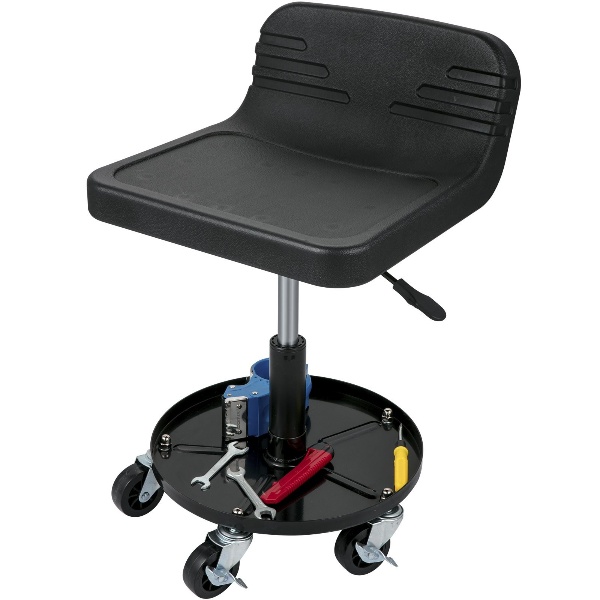 Stolička: Ak trávite veľa času sedením v garáži alebo dielni, určite sa oplatí investovať do ergonomickej pojazdnej stoličky. Garážová stolička sa bude skvele hodiť na všetky projekty, pri ktorých sa musíte ohýbať. Táto stolička s nosnosťou 135 kg umožňuje dospelému človeku bezpečne si sadnúť.