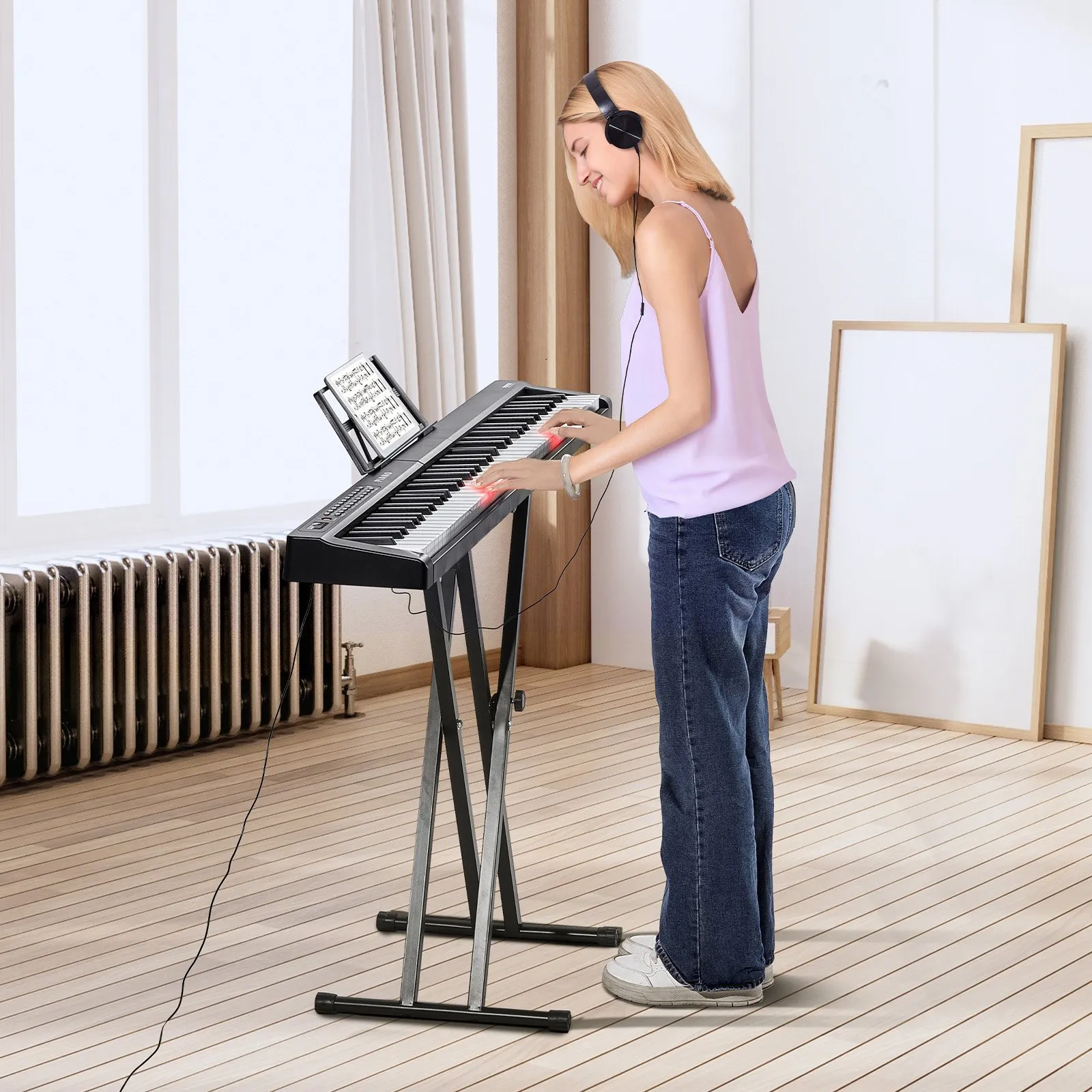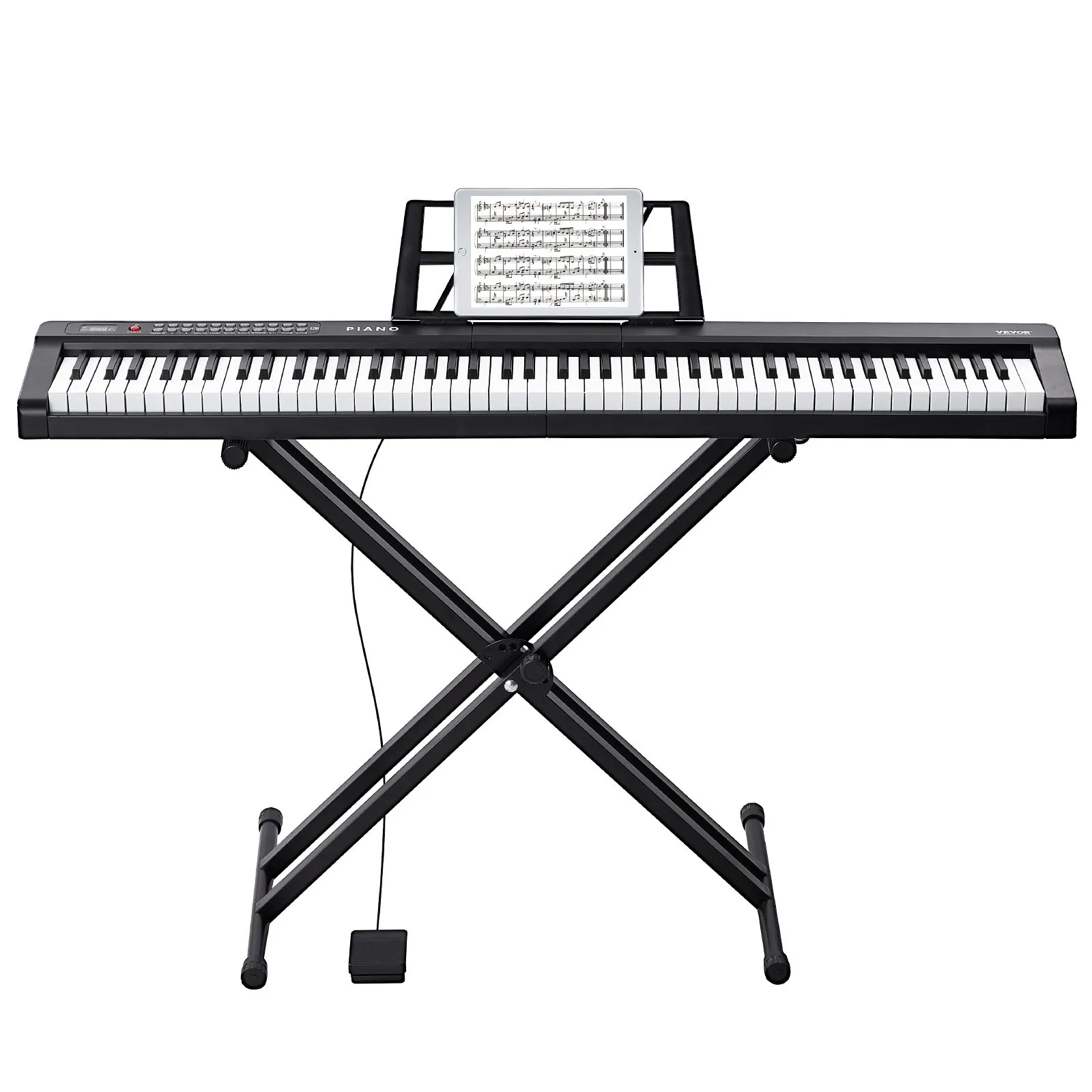Digitálne piano s 88 klávesmi, polovyvážené klávesy, sada klavírov s nastaviteľným stojanom, vstavané reproduktory, sustain pedál, slúchadlá, Bluetooth, MIDI, USB pre začiatočníkov.