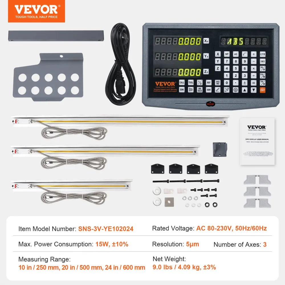 Digitálny displej 250, 500, 600 mm, 3-osová lineárna mierka, podporný kolík DRO, držiak noža, doska, puzdro, držiak napájacieho kábla hodín, mince, motýlik, skrutka, kryt, pravítko