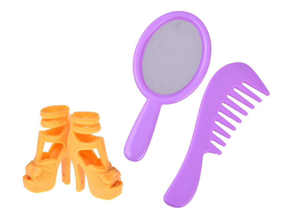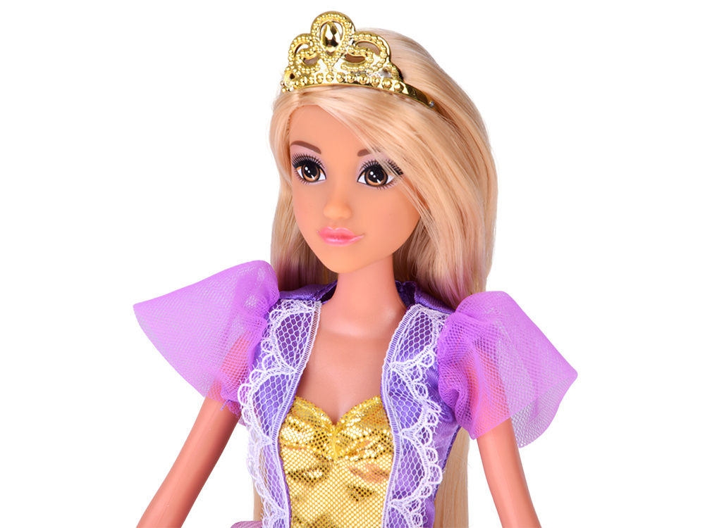 Princezná z kolekcie Anlily má na sebe fialovo-zlaté plesové šaty ozdobené trblietavými detailmi, vďaka ktorým vyzerá ako hviezda kráľovského plesu. Na hlave má zlatú tiaru/korunu a sada obsahuje zrkadlo a hrebeň – ideálne na česanie a úpravu jej dlhých vlasov.