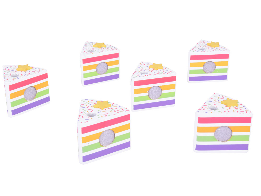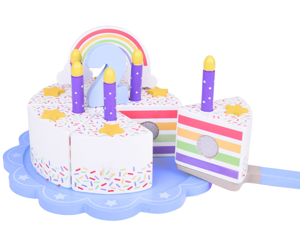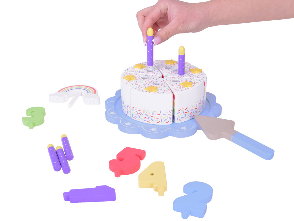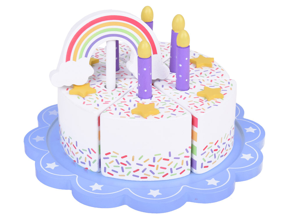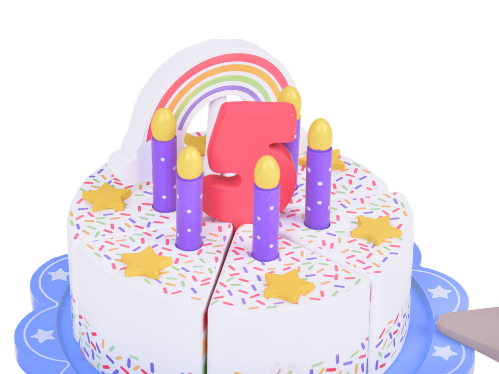 Táto fantasticky vyrobená narodeninová torta je perfektným doplnkom každej oslavy s bábikami a medvedíkmi! Táto farebná šesťdielna torta dokonale napodobňuje skutočnú tortu a umožňuje deťom krájať, deliť a podávať ju pomocou špachtle. ​​Vrch zdobí odnímateľná dúha farieb, ktorá jej dodáva nádych šarmu. Každá časť torty má samostatný svietnik, vďaka čomu je ideálna na plánovanie zábavnej narodeninovej oslavy.