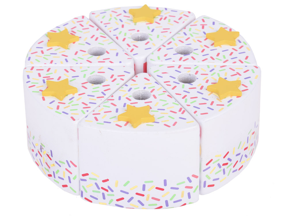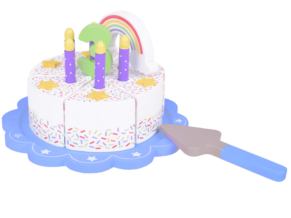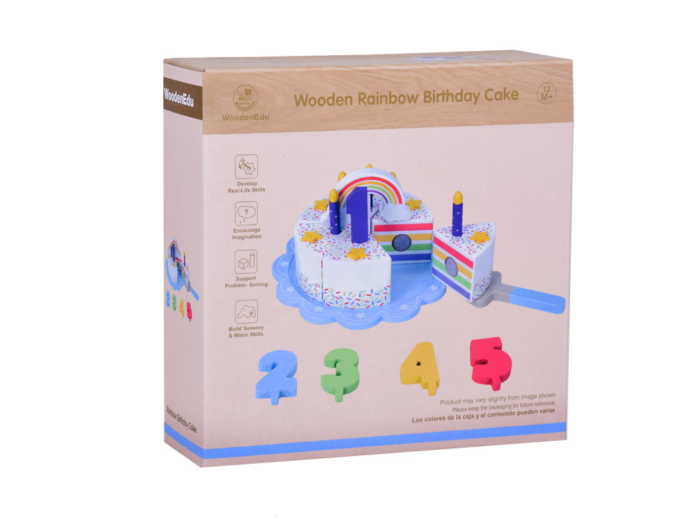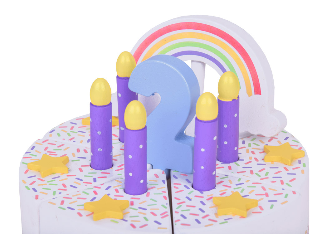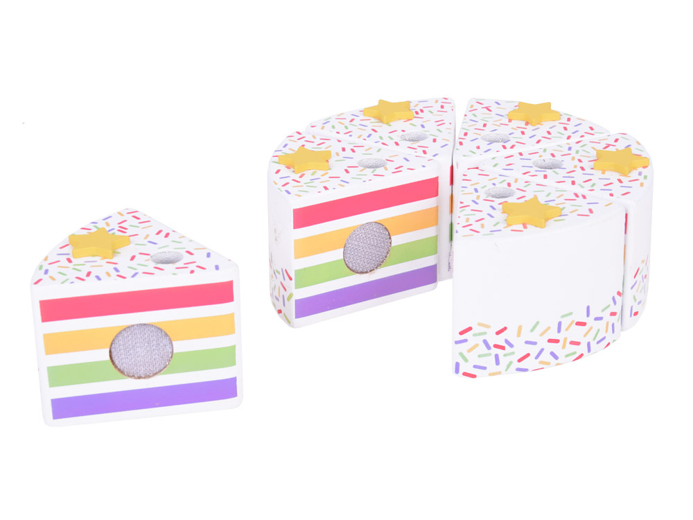 Táto fantasticky vyrobená narodeninová torta je perfektným doplnkom každej oslavy s bábikami a medvedíkmi! Táto farebná šesťdielna torta dokonale napodobňuje skutočnú tortu a umožňuje deťom krájať, deliť a podávať ju pomocou špachtle. ​​Vrch zdobí odnímateľná dúha farieb, ktorá jej dodáva nádych šarmu. Každá časť torty má samostatný svietnik, vďaka čomu je ideálna na plánovanie zábavnej narodeninovej oslavy.