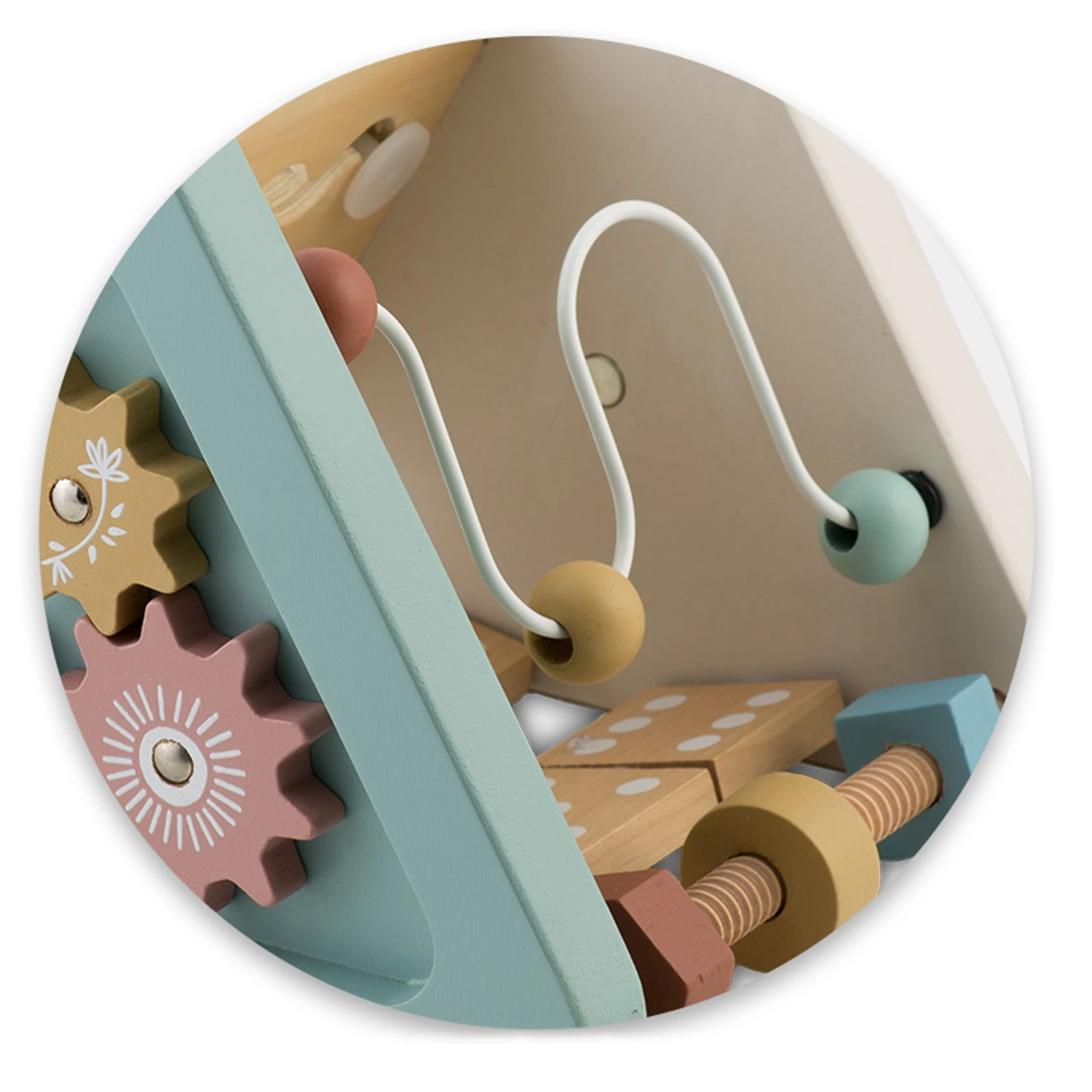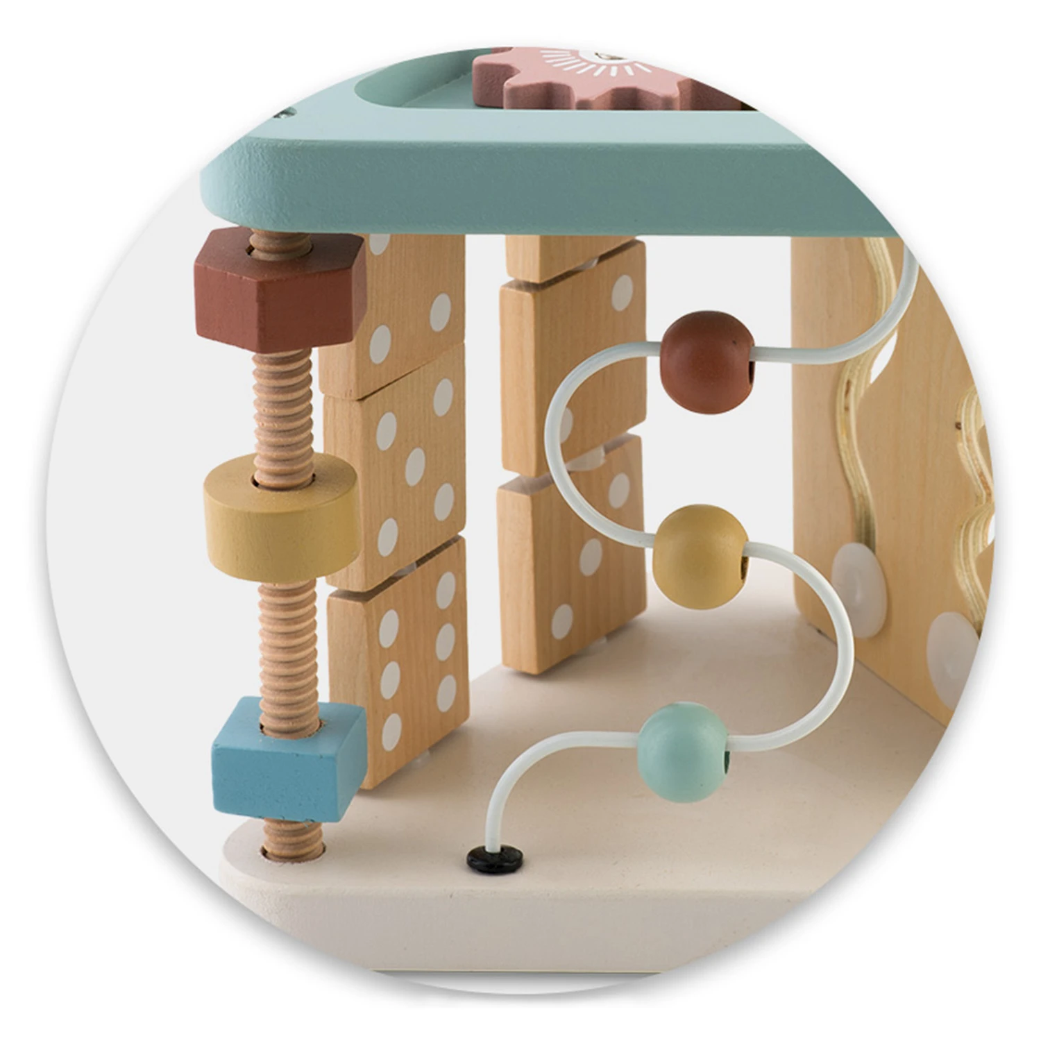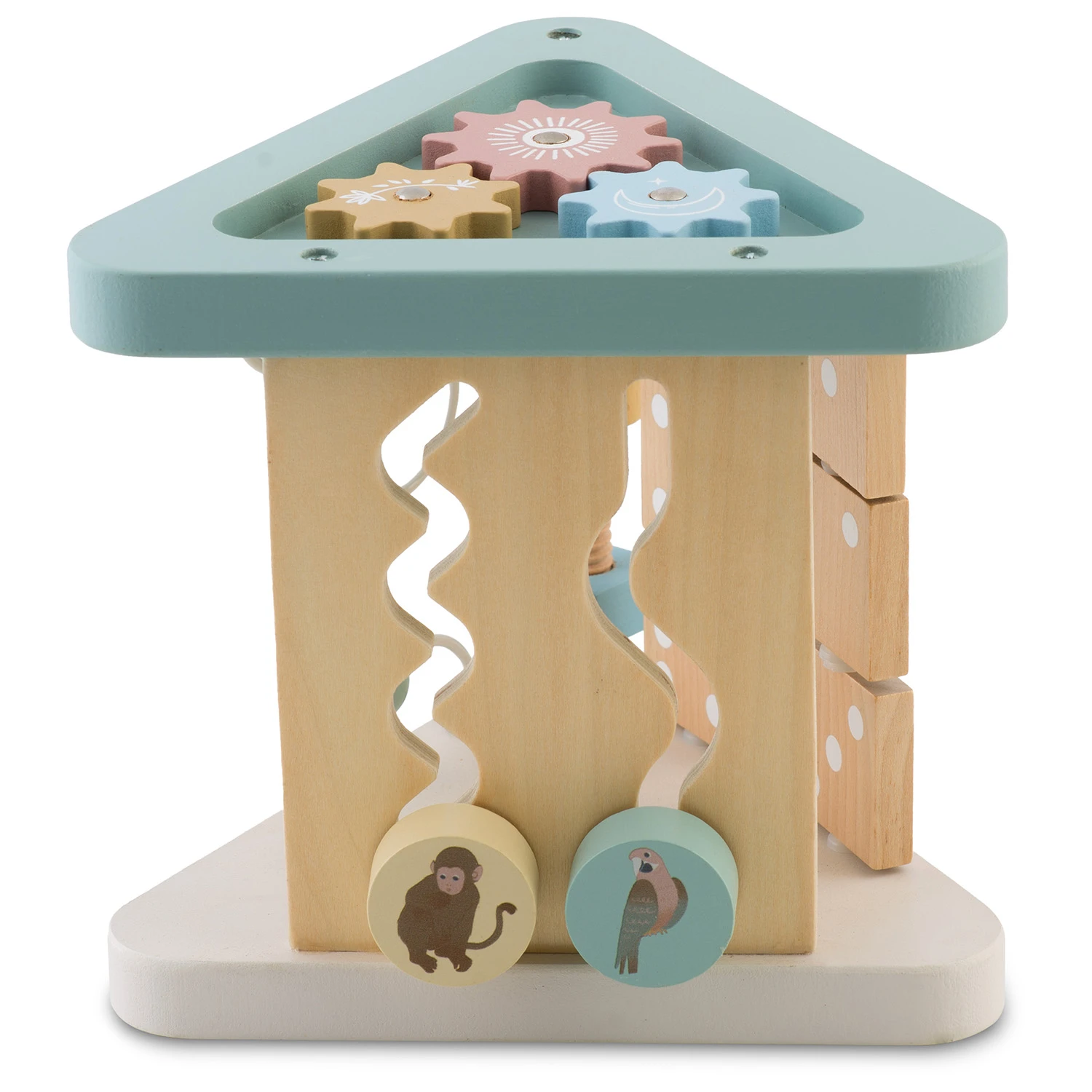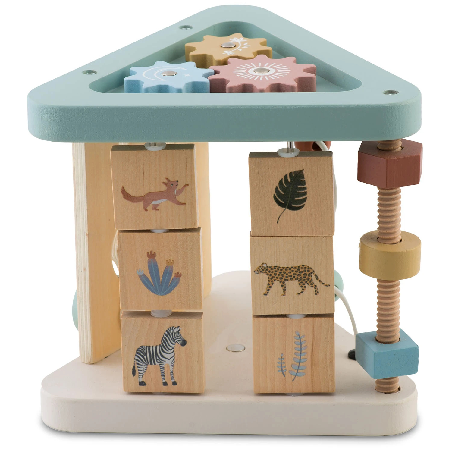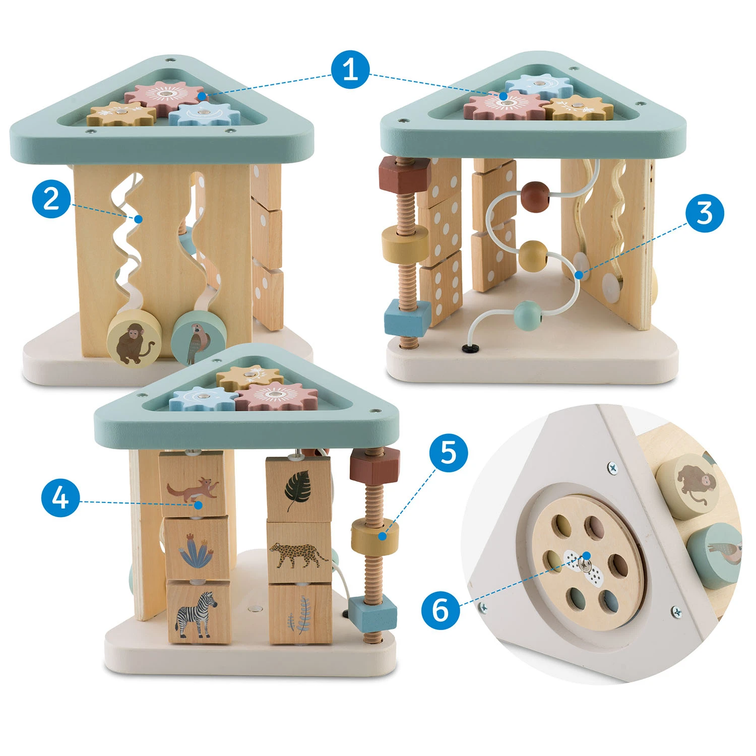 ✅ Bočné steny hračky sú zdobené pohyblivými kockami s ilustráciami zvierat, ktoré môžu slúžiť ako východiskový bod pre učenie sa názvov zvierat, rozvíjanie slovnej zásoby a stimuláciu fantázie.