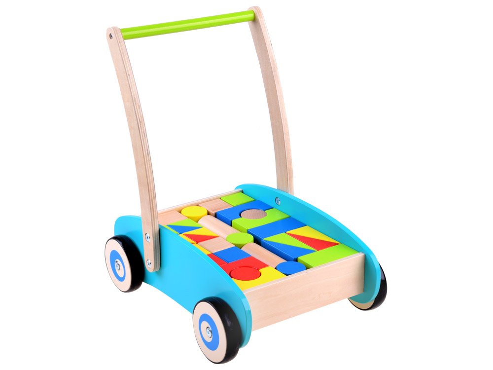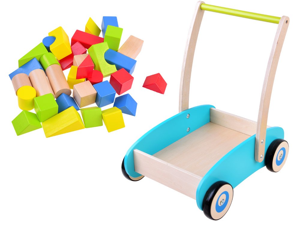 Drevené chodítko, kočík alebo športový kočík s farebnými, veľkými drevenými kockami určite poskytne veľa zábavy najmenším deťom, ktoré rady prenášajú svoje veci z miesta na miesto. Kocky sú navrhnuté tak, aby sa hodili do najmenších rúčok a sú ideálne na hranie v záhrade, na terase alebo dokonca na pláži. Kočík má na kolieskach gumené obruče, ktoré zaisťujú tichý a plynulý pohyb. Drevené kocky sú napriek svojej jednoduchosti jednou z najlepších foriem hry pre každé dieťa. Nielen preto, že sa nikdy nenudia, ale aj preto, že výrazne prispievajú k vývoju dieťaťa. Kočík sa dá použiť aj na prepravu bábik alebo plyšových zvieratiek, čo zaručí skvelú zábavu pre každé dieťa.