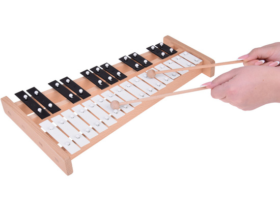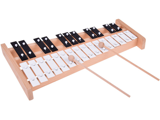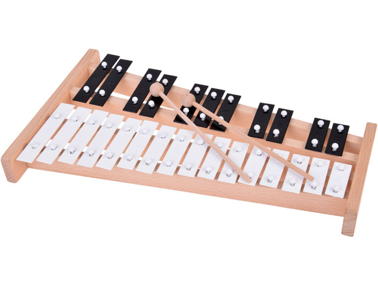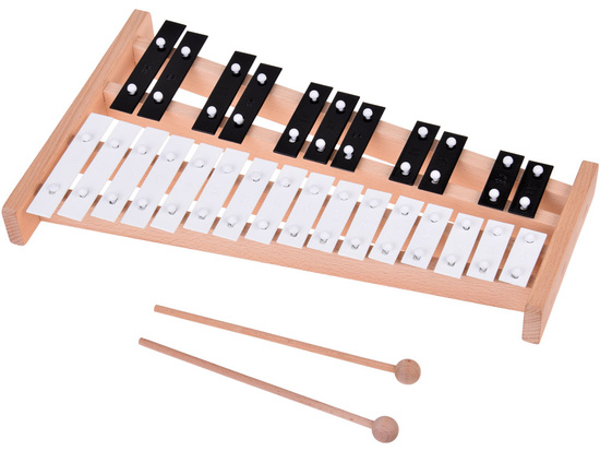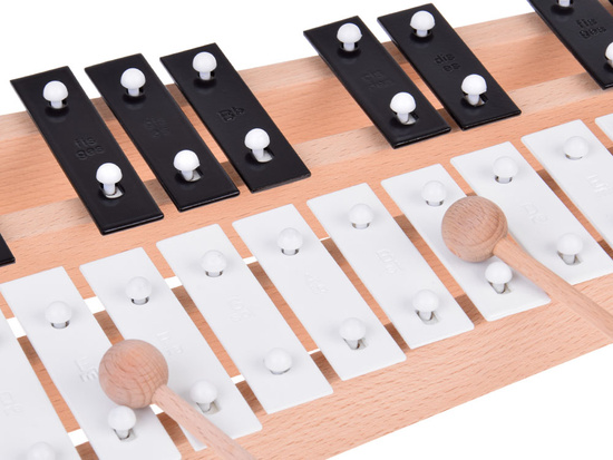 Kovové tyče zaručujú teplý a čistý zvuk vďaka penovým podložkám pod činelmi. Drevené paličky dokonalej veľkosti uľahčujú tvorbu dokonalého zvuku. Drážkované notové označenia na čineloch uľahčujú hranie, najmä v počiatočných fázach učenia sa hry na nástroj.