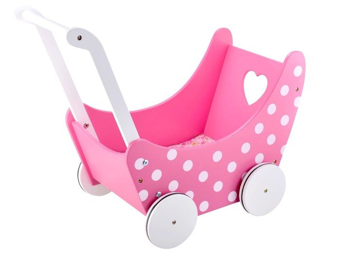 Tento pôvabný drevený kočík pre bábiky určite poteší každú malú opatrovateľku bábik, plyšových medvedíkov a iných plyšových hračiek. Kočík je starostlivo vyrobený z vysoko kvalitného dreva a má krásnu dievčenskú farebnú schému.