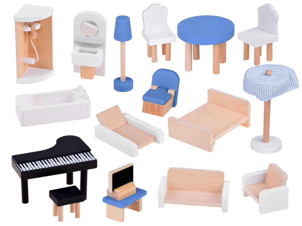 , – pohovka, – kreslo, – konferenčný stolík, – televízor, – klavír, – taburetka, – okrúhly stôl, – 2 stoličky, – sprchovací kút, – vaňa, – toaletný stolík so zrkadlom a umývadlom, – toaleta s otváracím sedadlom. Rozmery: – výška prízemie, prvé poschodie cca. 22,5 cm – výška v podkroví 23-30 cm – výška domu 78 cm – šírka 61,5 cm – hĺbka 26,5 cm Príklad rozmerov nábytku: – stôl 6 x 8 cm – stolička 7,5 x 4 x 4 cm – posteľ 12 x 9,5 x 5,5 cm – sprchovací kút 12 x 4,5 x 4,5 cm – toaletný stolík 11 x 5,5 x 3,5 cm