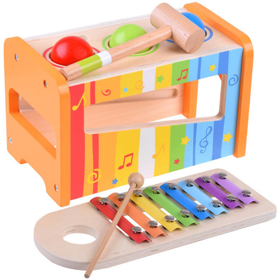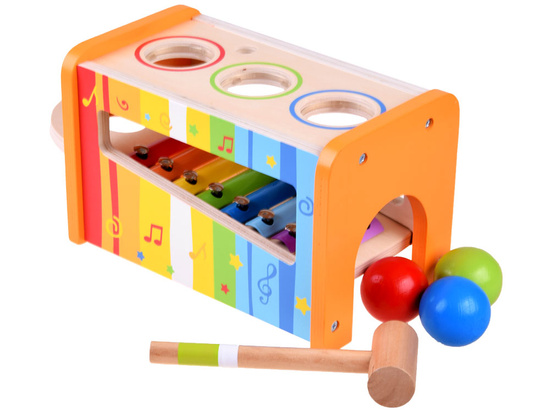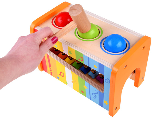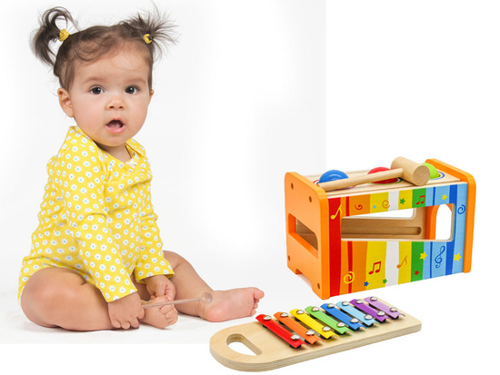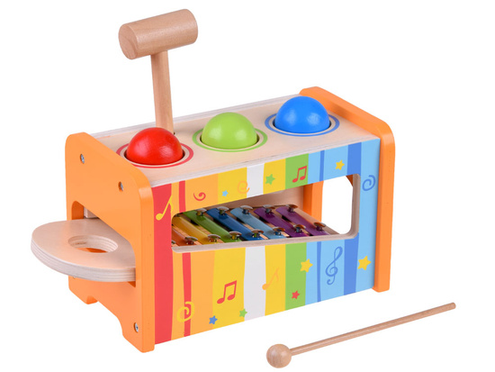 – Udieranie do činelov guľôčkami – deti môžu pretlačiť guľôčky cez otvor v skrinke, ktoré potom dopadnú na činely a vytvoria zvuk.Pri hraní s touto hračkou sa vaše dieťa naučí: