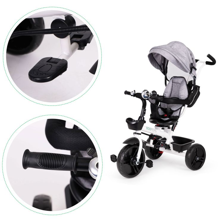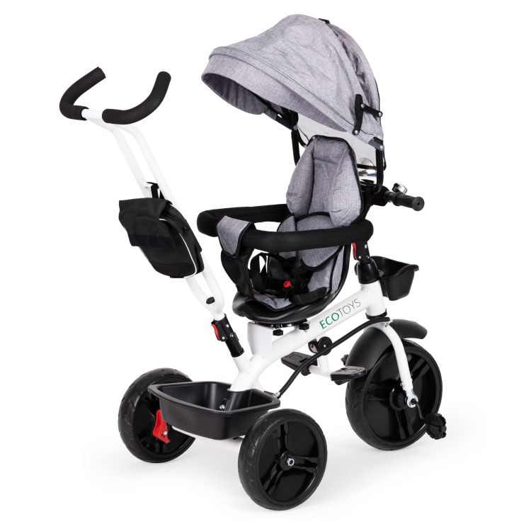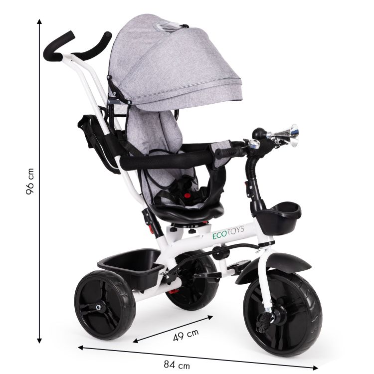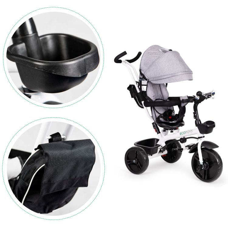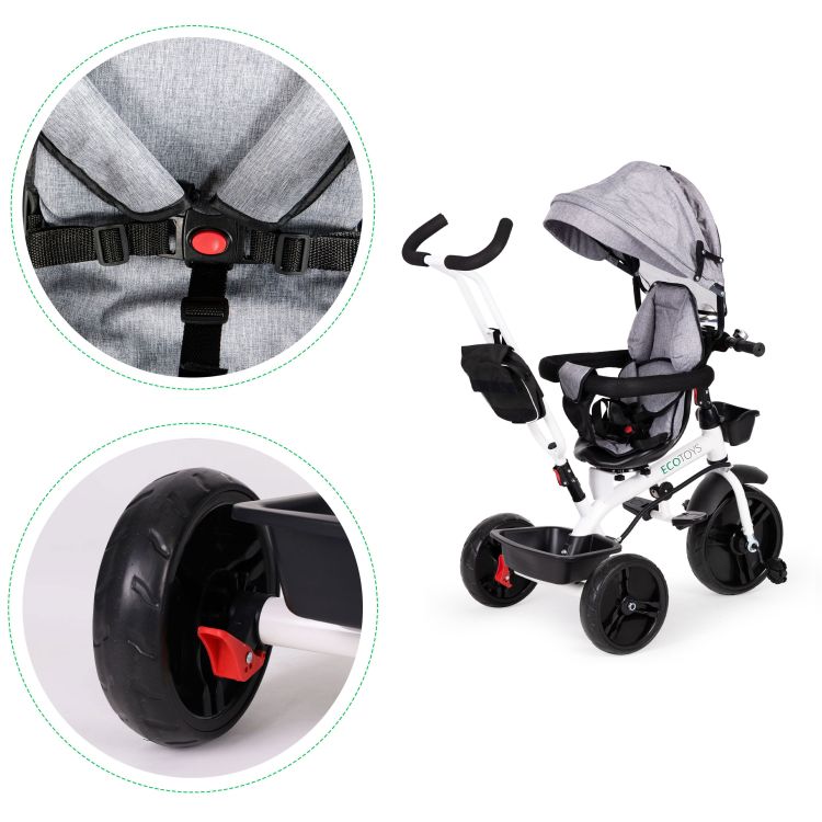 Bicykel sa dá použiť ako kočík alebo detský kočík. Rám je bezpečný a vyrobený z bielo natretej ocele. Bicykel má rukoväť, ktorá umožňuje rodičom ovládať jazdu. Sedlo sa dá otočiť tak, aby dieťa bolo otočené k rodičovi. Bezpečnosť dieťaťa zaisťuje 5-bodový bezpečnostný pás a nárazníky . Menšie deti môžu používať výsuvné opierky na nohy. Kolesá sú vyrobené z odolného materiálu EVA odolného voči prepichnutiu . Bicykel má tiež skladaciu striešku a ďalšie košíky. Produkt je vhodný pre deti vo veku od 12 mesiacov do 4 rokov s maximálnou hmotnosťou dieťaťa 25 kg .