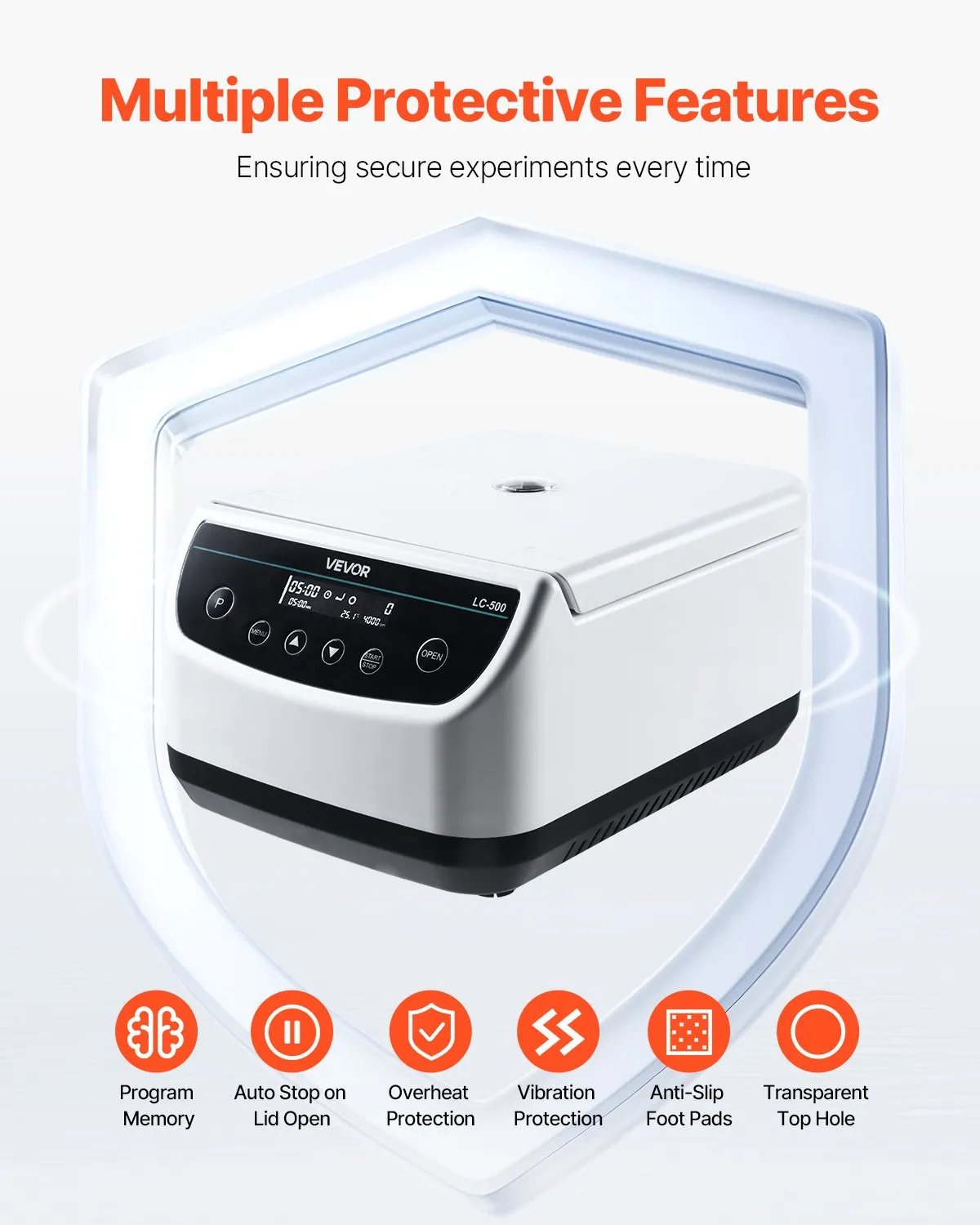 Bezpečnostné prvky: Vďaka programovej pamäti, automatickému zastaveniu veka, ochrane proti prehriatiu, ochrane proti vibráciám, protišmykovým nožičkám a priehľadnému vrchu zaisťuje táto laboratórna odstredivka bezpečnú prevádzku a tichý chod (max. 55 dB) pre tiché laboratórne prostredie.