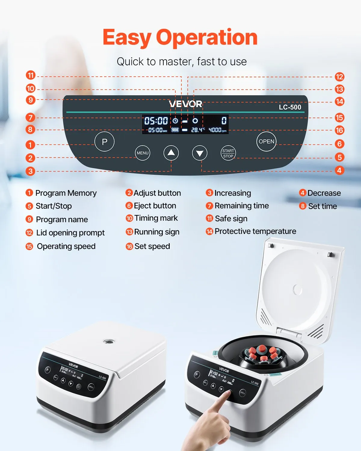 Jednoduché použitie: Naša laboratórna stolová centrifúga má vizuálny ovládací panel a jednoduchý dizajn tlačidiel, vďaka čomu je nastavenie parametrov a obsluha intuitívna a bez námahy, čo výrazne zvyšuje efektivitu a pohodlie pre plynulejšiu laboratórnu prácu.