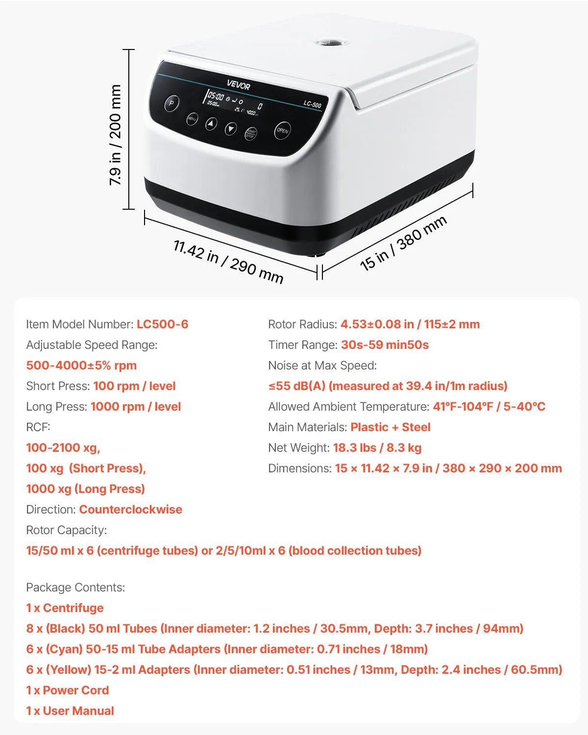 Všestranná kompatibilita: Tento laboratórny rotor centrifúgy pojme 6 x 15/50 ml centrifugačných skúmaviek alebo 6 x 2/5/10 ml skúmaviek na odber krvi, čím ponúka flexibilitu na efektívne spracovanie rôznych objemov a typov vzoriek.