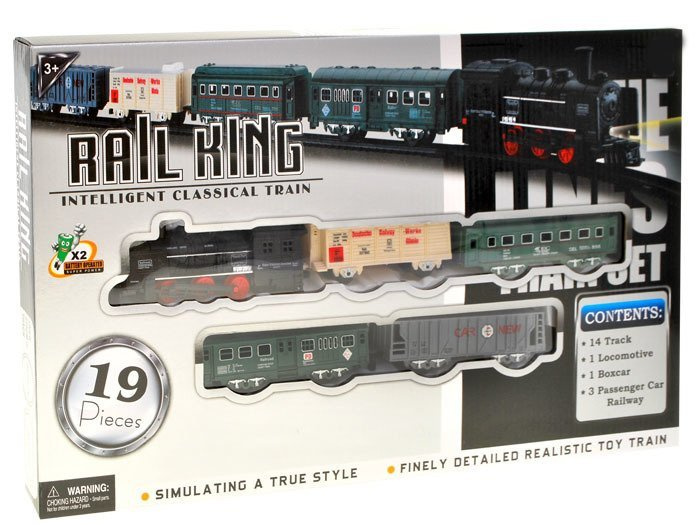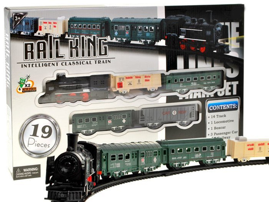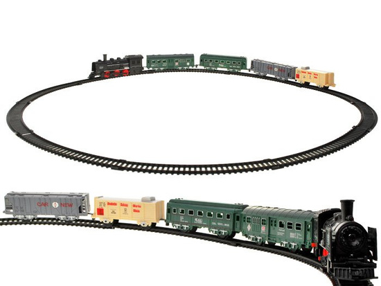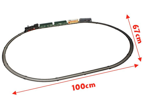 Napájanie z batérií (2xAA) zaisťuje bezpečnosť tým, že eliminuje potrebu sieťového adaptéra. Vláčik je poháňaný klasickou parnou lokomotívou. Okrem lokomotívy obsahuje sada 4 vagóny! Dva osobné vagóny a dva nákladné vagóny. Celý vlak (lokomotíva a všetky vagóny) má dĺžku 65 cm. Kompletná sada koľají po zostavení má dĺžku 100 cm a šírku 67 cm.