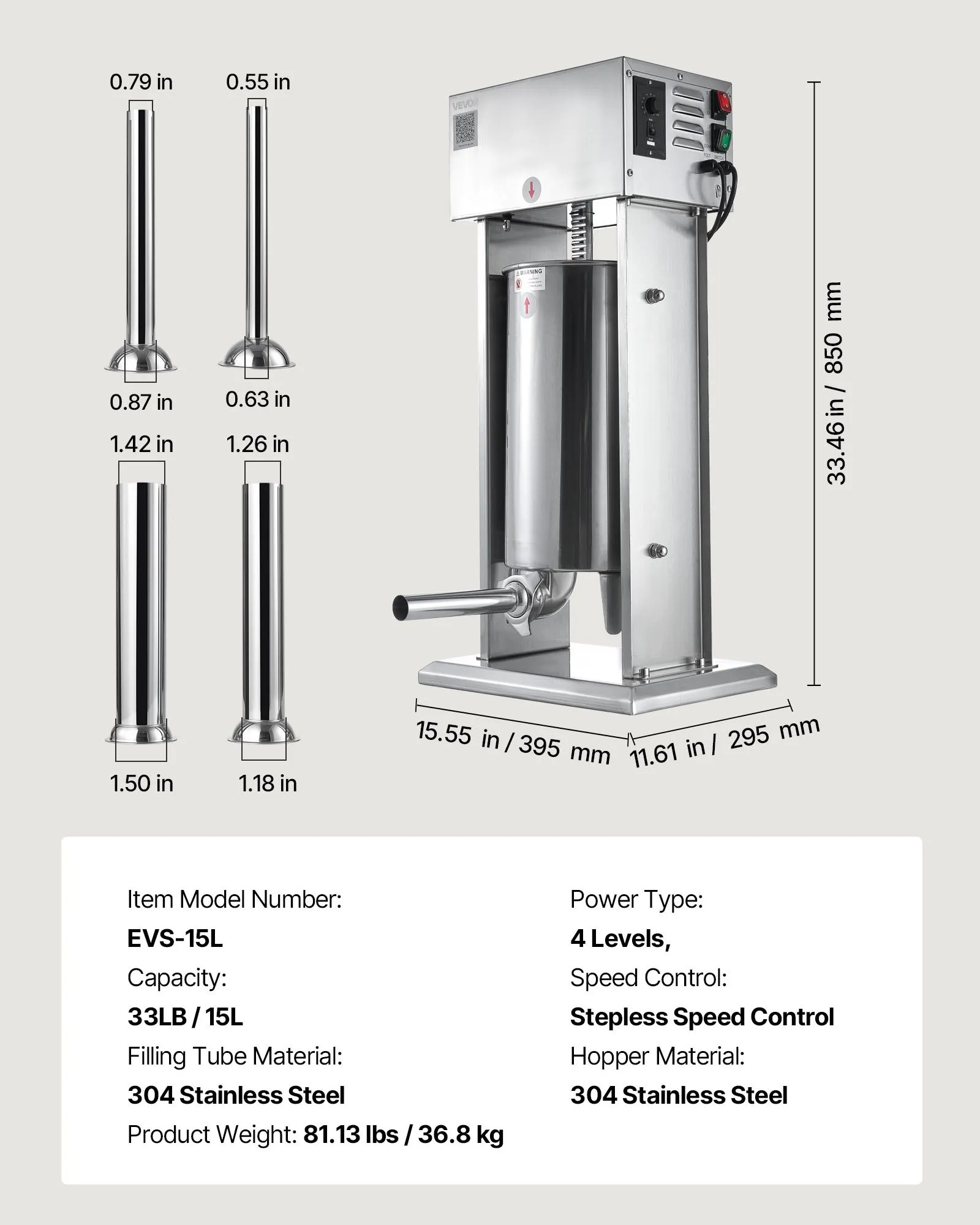 • Kompletné príslušenstvo: Táto vertikálna plnička klobás obsahuje štyri plniace trubice vyrobené z nehrdzavejúcej ocele SUS 304: ⌀0,63 (0,55) palca, ⌀0,87 (0,79) palca, ⌀1,26 (1,18) palca a ⌀1,50 (1,42) palca. Všetky časti prichádzajúce do kontaktu s potravinami spĺňajú normy potravinárskej kvality a majú hladký vnútorný povrch bez otrepov.