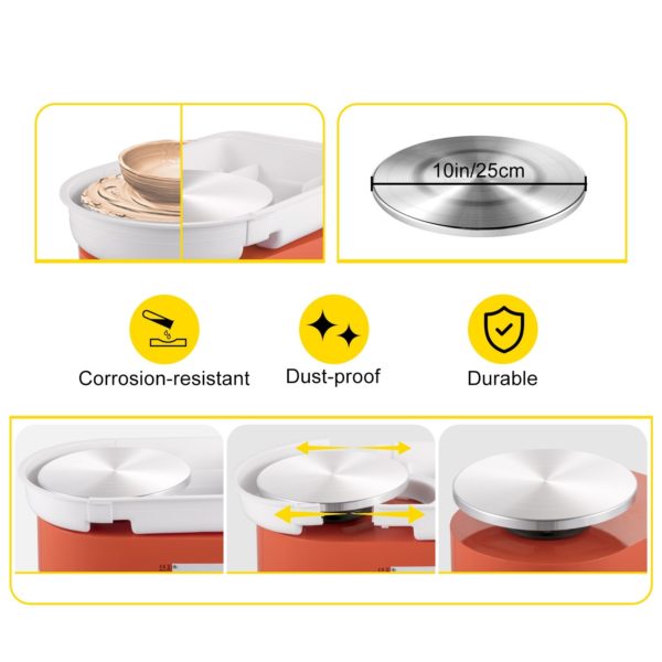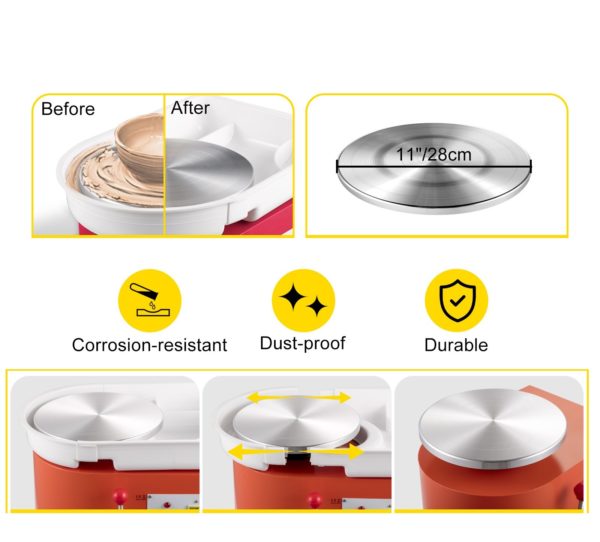 Tento malý stroj na hrnčiarsky kruh má kompaktnú štruktúru s krásnym vzhľadom. Dodáva sa s odnímateľnou nádržou na vodu a 11″ vysokokvalitným otočným tanierom z hliníkovej zliatiny, ktorý sa môže otáčať v dvoch smeroch. Okrem toho výkonný motor pomáha tomuto keramickému koliesku pracovať stabilne a s nízkou hlučnosťou, zvlášť vhodný pre školské vyučovanie, keramiku pre domácich majstrov.