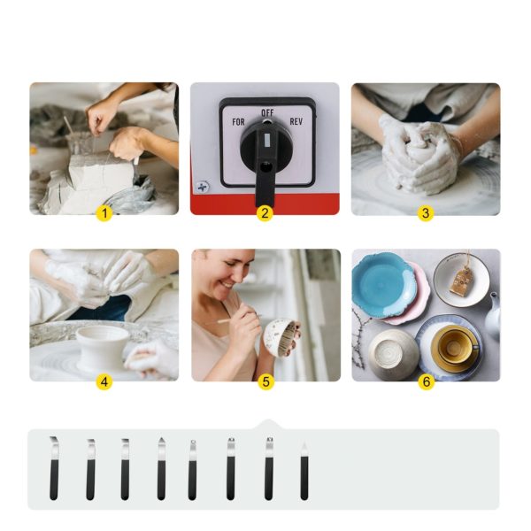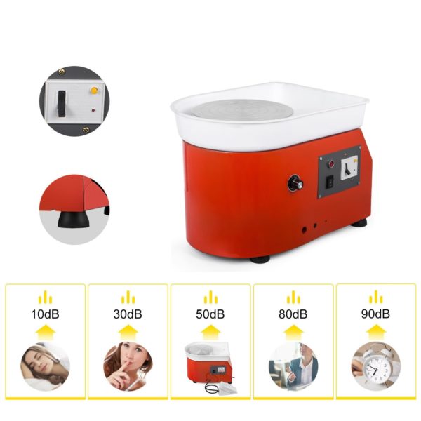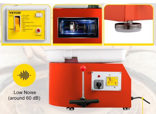 Flexibilná prevádzka: Tento hrnčiarsky kruh je dodávaný s nožným pedálom a rýchlostnou manuálnou rukoväťou, ktorá sa hladko otáča s nízkou hlučnosťou (menej ako 60 dB) a účinkom 0-300 ot./min. Dá sa prepínať v smere alebo proti smeru hodinových ručičiek, čím sa zvyšuje flexibilita keramického procesu.
