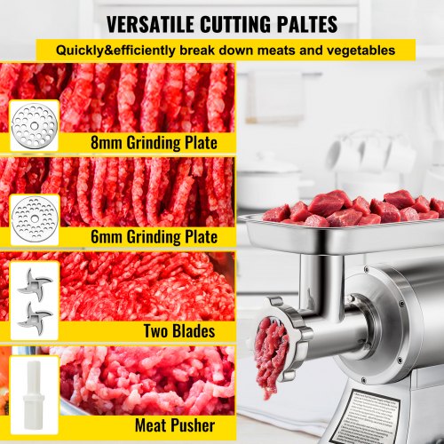 Dômyselné detaily – Dodáva sa s dvomi rôznymi veľkosťami mlecích dosiek, aby vyhovoval všetkým vašim potrebám pri varení; Vybavený zásobníkom na mäso, ktorý poskytuje ideálne miesto na uchovávanie kúskov mäsa po ruke, pripravených na mletie. Súčasťou balenia je zatláčadlo na mäso na pohodlné plnenie mäsa.