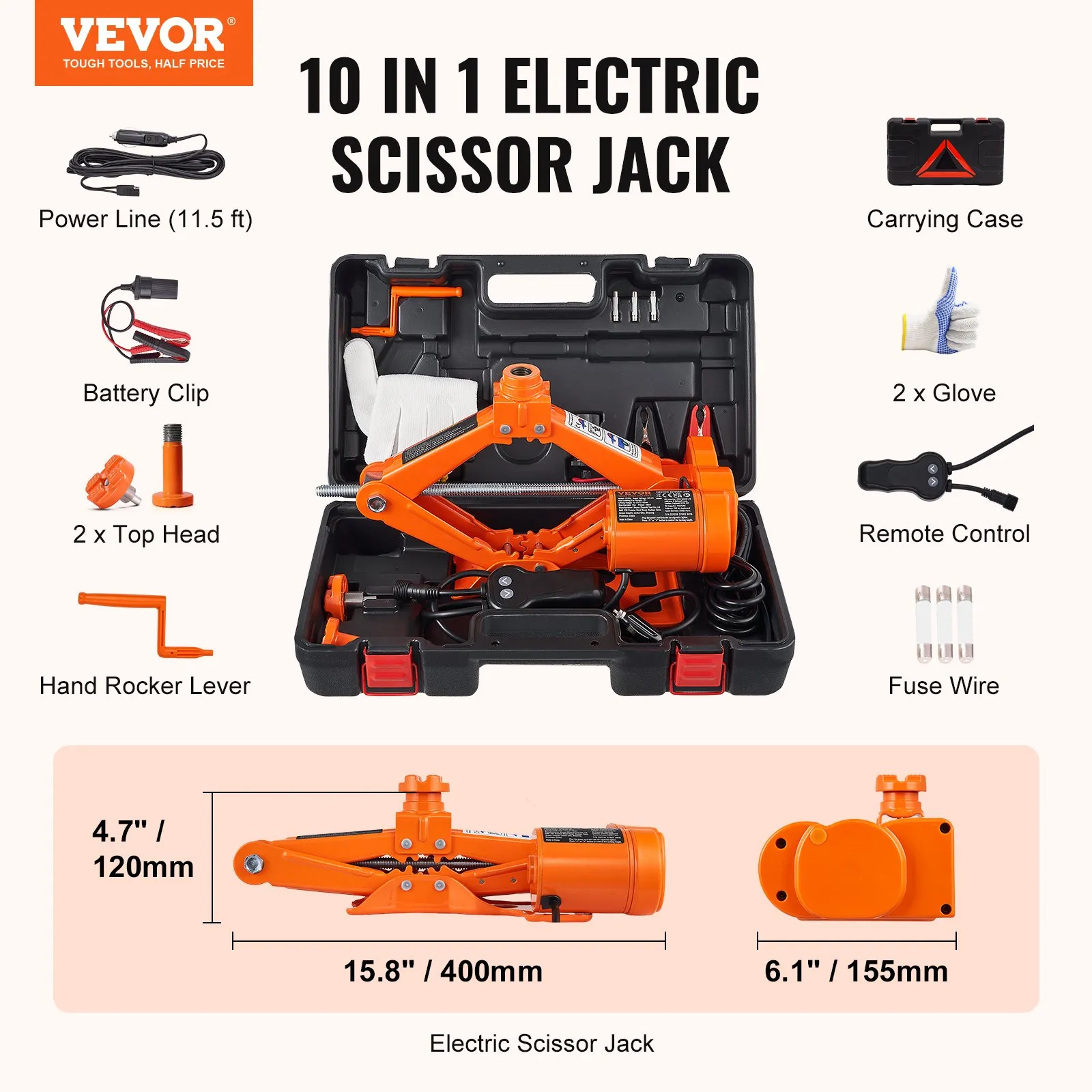Elektrický nožnicový zdvihák: Maximálna nosnosť: 3 t / 6600 libier. Rozsah zdvihu (krátka zdvíhacia hlava): 5,1 – 14,6 palca / 130 – 370 mm; rozsah zdvihu (dlhá zdvíhacia hlava): 6,7 – 16,5 palca / 170 – 420 mm. Tento elektrický podlahový zdvihák je záchranou v núdzových situáciách na ceste a možno ho použiť na opravy vo vašej domácej dielni. Je vhodný pre sedany, SUV, dodávky alebo akékoľvek iné vozidlo, ktoré zodpovedá jeho nosnosti.