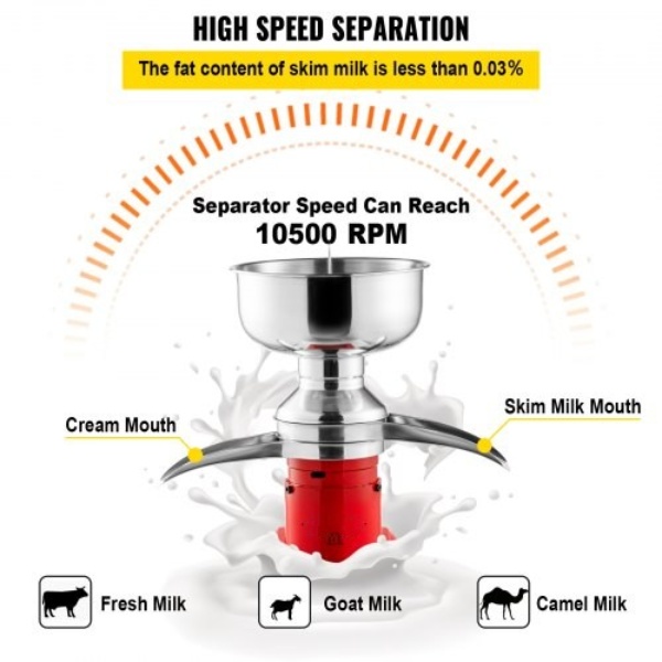 Silná odstredivá rýchlosť – Tento separátor mlieka využíva odstredivú silu na oddelenie mlieka na smotanu a odstredené mlieko. Vďaka vysokej rýchlosti 10500 otáčok za minútu, ktorá zabezpečuje účinnosť, dokáže zariadenie dôkladnejšie oddeliť smotanu a obsah tuku v odstredenom mlieku môže byť nižší ako 0,03 %. Energeticky úsporný 30 W motor.