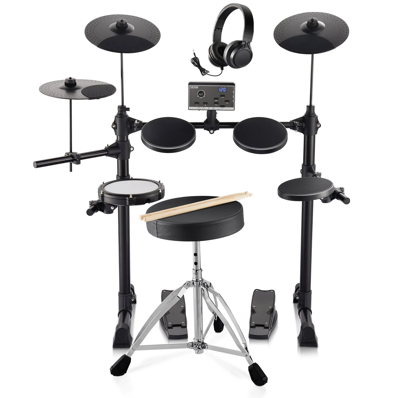 Kompletná bicia súprava: Táto elektronická bicia súprava obsahuje štyri 6,5-palcové (165,1 mm) bubny a tri 10-palcové (25,4 cm) činely, ktoré vám poskytujú kompletný bubnový povrch. Súčasťou balenia je modul bicích, paličky a pedále, ako aj slúchadlá a nastaviteľné sedadlo. Ideálne pre začiatočníkov a rytmický tréning!