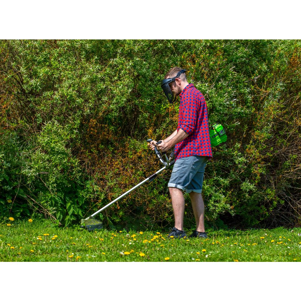 Motor umiestnený pri hlave vyvažujú batérie na konci spojovacej tyče, takže sa s krovinorezom