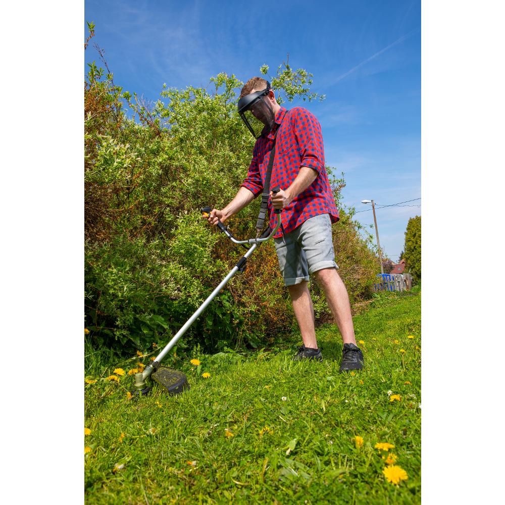 tiež praktický ramenný popruh. V balení nájdete tiež trojzubý vyžínací kotúč a strunovú hlavu.