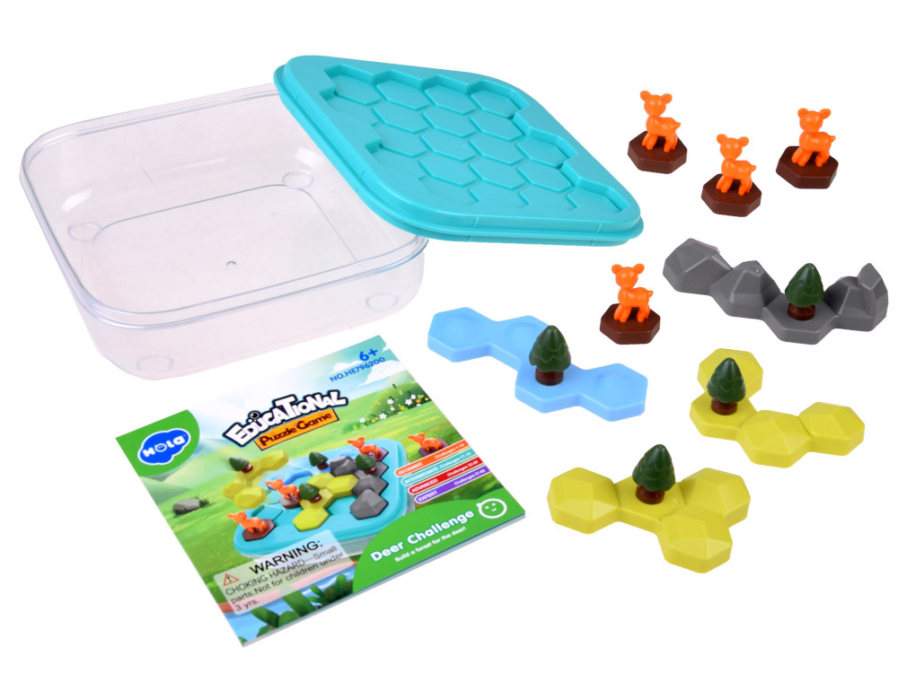 Priložená brožúra obsahuje 60 hádaniek rozdelených podľa úrovne obtiažnosti. Úrovne sú označené farbami a hviezdičkami. Vyberte si jednu z hádaniek a usporiadajte jeleňa podľa obrázka. Úlohou dieťaťa je usporiadať priehradky tak, aby boli všetky štvorce na hracej doske obsadené. Jeleň sa počas hry nedá presúvať ani odstraňovať z hracej dosky.
