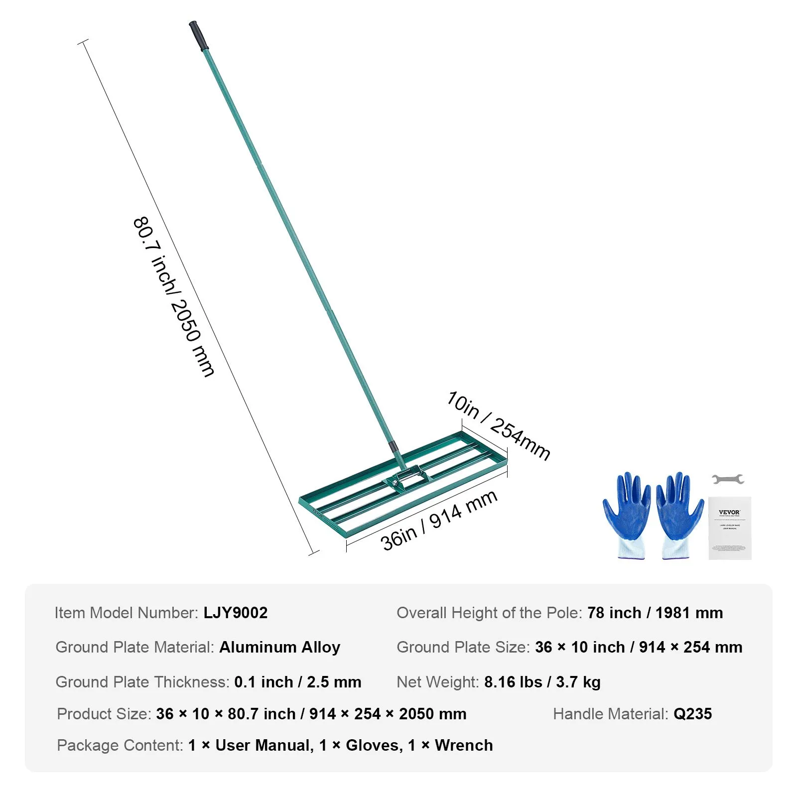 Hrable na trávu 914×254 mm základná doska vyrovnávací nástroj z hliníkovej zliatiny a ocele Q235 vyrovnávací nástroj hrable na trávu s tyčou 1981 mm základná doska na golfové ihrisko vyrovnávací nástroj na trávu na vyrovnávanie piesku, pôdy, kompostu a machu